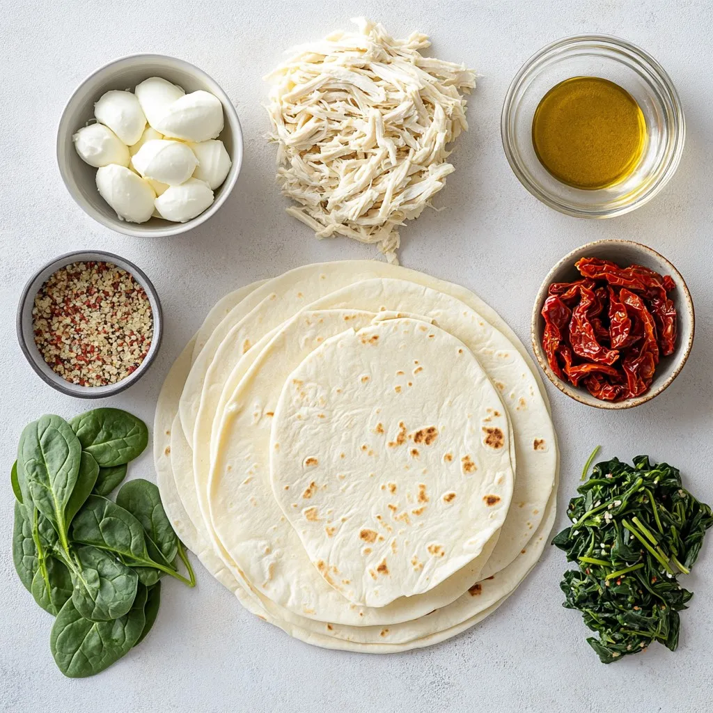 The main ingredients set the stage for this dish. Flour tortillas give a soft and chewy base. Shredded cooked chicken adds protein and heartiness. Fresh mozzarella cheese melts beautifully, creating a delightful texture.