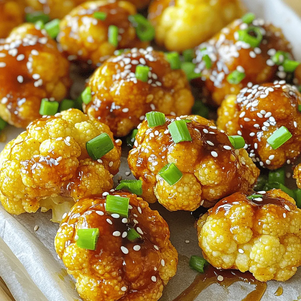 - Cauliflower florets - Honey and soy sauce - Garlic and ginger Using fresh cauliflower florets makes the bites crunchy and tasty. You will need one large head of cauliflower, cut into small pieces. For the sweet and savory flavor, mix three tablespoons of honey with two tablespoons of soy sauce. Garlic and ginger add rich flavor. Use two minced garlic cloves and one teaspoon of ground ginger for this recipe. - Olive oil - Cornstarch - Sesame seeds and green onions for garnish For added flavor and crunch, one tablespoon of olive oil is necessary. Coat the cauliflower in one teaspoon of cornstarch. This step ensures a crispy texture when air frying. Finally, garnish with sesame seeds and chopped green onions to make your dish look appealing. - Salt and pepper Don’t forget to season the cauliflower with salt and pepper. This step enhances the overall taste. Adjust the amounts to match your personal preference. To start, preheat your air fryer to 400°F (200°C). This takes about 5 minutes. While it heats, prepare the marinade. In a large mixing bowl, mix together 3 tablespoons of honey, 2 tablespoons of soy sauce, 1 tablespoon of olive oil, 2 minced garlic cloves, and 1 teaspoon of ground ginger. Stir until smooth. Now, add 1 large head of cauliflower, cut into bite-sized florets, to the bowl. Toss the florets in the marinade. Make sure each piece gets a good coating. This gives the cauliflower its sweet and savory flavor. Next, sprinkle 1 teaspoon of cornstarch over the coated florets. Mix again until the florets are evenly covered. The cornstarch helps create that crispy texture we want. Place the cauliflower florets in the air fryer basket. Arrange them in a single layer for best results. You might need to cook in batches, depending on your air fryer size. Cook for 12-15 minutes. Remember to shake the basket halfway through. This ensures all sides crisp up evenly. You want the bites to turn golden brown and crispy. After cooking, drizzle any leftover marinade on top for extra flavor. Garnish with sesame seeds and chopped green onions before you serve. To get that perfect crunch, cornstarch is a key ingredient. It helps create a crispy coat. When you mix it with the cauliflower, it absorbs moisture and turns golden during cooking. Make sure to coat the florets evenly for the best result. Cooking in batches is also important. If you crowd the air fryer, the airflow will be poor. This can lead to soggy bites. Instead, cook smaller portions. This way, each piece gets nice and crispy. You can amp up the flavor by using extra marinade. After air frying, drizzle any leftover marinade over the bites. This adds a rich taste that makes each bite burst with flavor. For serving, consider dips for added fun. A touch of sriracha adds heat. A yogurt-based dip provides a cool contrast. Both options pair well with the honey garlic flavor. Plating can make a big difference. Serve your cauliflower bites on a platter lined with parchment paper. It keeps them warm and adds a nice touch. Enhance the visual appeal by adding a sprinkle of sesame seeds and chopped green onions. This not only looks great but also adds texture. Your guests will be impressed by the lovely colors and presentation! {{image_2}} If you want a gluten-free version, use tamari instead of soy sauce. Tamari has a similar taste but lacks gluten. It keeps the dish tasty while meeting dietary needs. Many stores carry tamari, making it easy to find. Just swap it one-for-one with soy sauce in your recipe. To spice things up, add chili flakes or sriracha to the marinade. A pinch of chili flakes brings warmth without overpowering the dish. If you like it hotter, sriracha is a great choice. Just mix in a teaspoon or more based on your heat preference. The extra kick adds depth and excitement to the flavor. You can switch up the garnish for a fun twist. Instead of sesame seeds, try crushed peanuts or hemp seeds. Both add great crunch and flavor. For a different color, use chopped cilantro or parsley instead of green onions. These options make your dish more vibrant and appealing. Feel free to get creative with garnishes! To store your leftover honey garlic cauliflower bites, let them cool first. Then, place them in an airtight container. This keeps them fresh in the fridge. They will stay good for about three days. When you want to eat them again, check for any signs of spoilage. If they smell off, it’s best to toss them. For the best results when reheating, use your air fryer. Preheat it to 375°F (190°C). Place the cauliflower bites in the basket in a single layer. Heat them for about 5 to 7 minutes. This method keeps them crispy. You can also use a regular oven, but it may take longer to get that crunch back. If you want to freeze your cauliflower bites, do it right after cooking. Let them cool, then place them in a freezer-safe bag. Squeeze out as much air as you can. They will keep well for about a month. To thaw, place them in the fridge overnight. Reheat them in the air fryer for the best texture. Yes, you can use frozen cauliflower. It will save you time. Make sure to thaw and drain it first. Pat it dry with a towel. This helps remove extra water. Too much moisture can make the bites soggy. If using frozen, reduce the cooking time by a few minutes. Check for crispness as they cook. To kick up the heat, add chili flakes to the marinade. Start with half a teaspoon and taste it. You can also mix in sriracha or hot sauce. Adjust the amount based on your spice level. Another option is to add sliced jalapeños before air frying. These changes add flavor and heat. These bites pair well with many side dishes. Serve them with rice or quinoa for a meal. You can also offer a fresh salad. A yogurt-based dip complements the flavors nicely. Try a spicy aioli for an extra kick. These options make the dish more filling and enjoyable. This blog post covers how to make honey garlic cauliflower bites. We explored the main ingredients, like fresh cauliflo