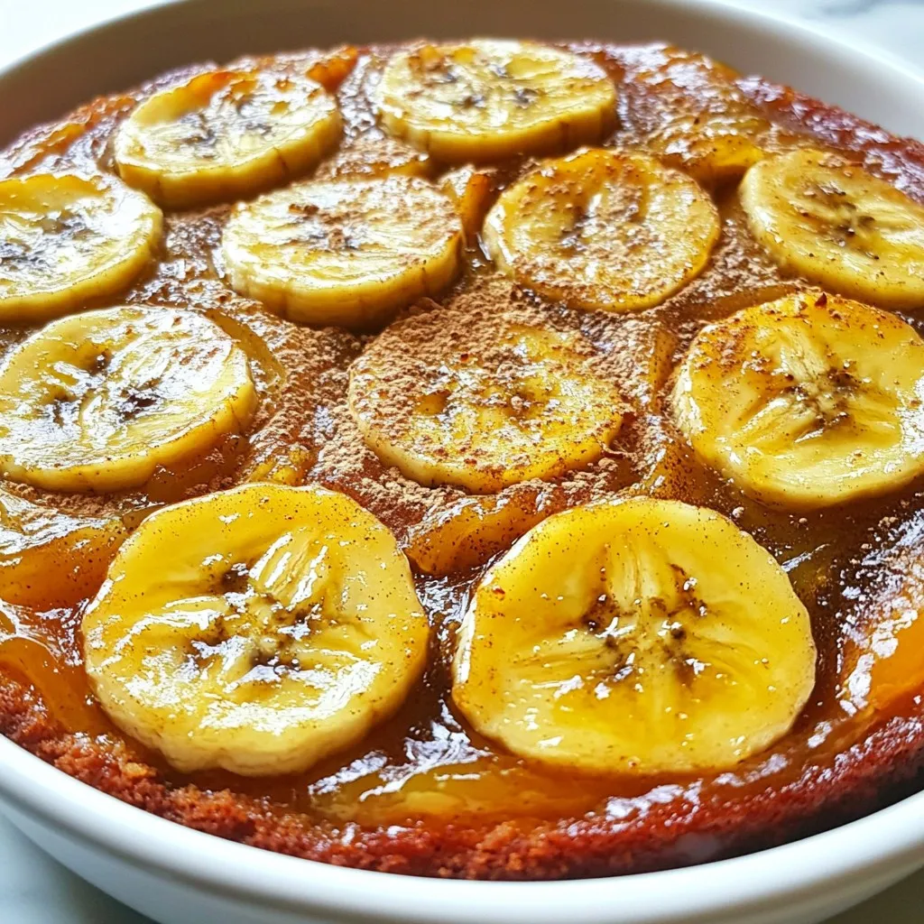 A delightful upside-down cake featuring ripe bananas and a caramelized brown sugar topping.