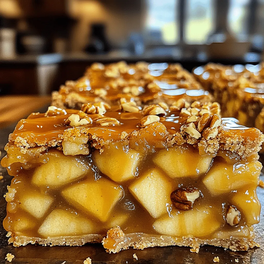 To make delicious caramel apple pie bars, you need: - 2 cups all-purpose flour - 1/2 cup granulated sugar - 1/4 teaspoon salt - 1 teaspoon cinnamon - 1/2 cup unsalted butter, melted - 1 large egg - 4 cups apples, peeled, cored, and diced (mix tart and sweet apples) - 1/2 cup brown sugar - 1 tablespoon lemon juice - 1 teaspoon vanilla extract - 1/2 cup caramel sauce (store-bought or homemade) - Extra caramel sauce for drizzling on top You can add some fun twists to your bars: - 1/4 cup chopped walnuts or pecans for crunch - A pinch of nutmeg for extra warmth - Dried cranberries for a tart kick Choosing the best apples is key. Here’s how to pick them: - Mix tart and sweet: Use a blend like Granny Smith for tartness and Fuji for sweetness. - Freshness matters: Look for firm apples without bruises or soft spots. - Seasonal choices: Fall is the best time for fresh apples. They taste great and are crispier. By following these tips, your caramel apple pie bars will shine with flavor! First, preheat your oven to 350°F (175°C). This step is key to getting the perfect bake. Next, take a 9x13 inch baking pan and line it with parchment paper. Leave some paper hanging over the edges. This will help you lift the bars out easily later. In a large mixing bowl, combine 2 cups of all-purpose flour, 1/2 cup of granulated sugar, 1/4 teaspoon of salt, and 1 teaspoon of cinnamon. Mix these dry ingredients well. Pour in 1/2 cup of melted unsalted butter. Then add 1 large egg to the bowl. Stir until a crumbly dough forms. This dough will be the base of your bars. In another bowl, take 4 cups of diced apples. Peel, core, and dice them first. A mix of tart and sweet apples works best for great flavor. Toss the apples with 1/2 cup of brown sugar, 1 tablespoon of lemon juice, and 1 teaspoon of vanilla extract. Make sure the apples are well coated with this mix. Press about two-thirds of the dough firmly into the bottom of your prepared pan. This will form your crust. Spread the apple mixture evenly over the crust. Drizzle half of the caramel sauce over the apples. If you like, sprinkle 1/4 cup of chopped walnuts or pecans on top. Crumble the remaining dough over the apples. Bake in your preheated oven for 30 to 35 minutes. Look for a golden brown top and tender apples. Once baked, take the pan out of the oven and let it cool completely. This step is important! After cooling, drizzle the remaining caramel sauce over the top for added sweetness. Cut the cooled bars into squares and serve. Enjoy your delicious caramel apple pie bars! To make the best crust, start with cold butter. Cut it into small pieces. This keeps the crust flaky and light. Use a fork or your fingers to mix the butter into the flour mixture. You want small crumbs, not a dough. Press two-thirds of the crust into the pan firmly. This step is key for a strong base. You can change the sweetness based on your taste. If you prefer less sweet, cut back on the brown sugar. You can also add more tart apples. This balances the flavors well. Taste the apple mixture before adding caramel. Adjust it until you find what you love. Making homemade caramel sauce is easy and fun! Use sugar, cream, and butter in a pot. Heat them slowly until they melt together. Stir well to avoid lumps. Let it cool before drizzling on your bars. Homemade caramel gives a richer taste than store-bought. Plus, you can customize the sweetness! {{image_2}} You can make these bars even tastier by adding spices. Try using nutmeg or allspice with the cinnamon. Just a pinch will add warmth and depth. You can also add ginger for a spicy kick. Mix these spices into the flour before making the crust for a big flavor boost. While apples are the star, other fruits work well too. Try adding pears for a sweet twist. Cherries can also add a nice tartness. Just keep the total fruit amount the same. This way, you maintain the right texture and sweetness in the bars. You can make these bars gluten-free easily. Use almond flour or a gluten-free flour blend. Just follow the same measurements. For a vegan option, swap the butter with coconut oil and the egg with flaxseed meal mixed with water. This keeps the bars moist and delicious. To keep your caramel apple pie bars fresh, store them in an airtight container. Place parchment paper between layers to avoid sticking. If you have extra caramel sauce, keep it in a separate container. You can also cover the entire dish tightly with plastic wrap. This helps lock in moisture and flavor. When stored correctly, these bars last for about 3 to 5 days at room temperature. For longer storage, keep them in the fridge. They can stay fresh for up to a week in the refrigerator. Just remember to seal them well to avoid drying out. If you want to enjoy warm caramel apple pie bars, reheating is easy. Preheat your oven to 350°F (175°C). Place the bars on a baking sheet and cover them with foil. Heat for about 10-15 minutes, or until warm. You can also use a microwave for quick reheating. Just warm them for 20-30 seconds. Add a drizzle of caramel sauce before serving for extra flavor! Yes, you can use frozen apples. Just thaw them first. Make sure to drain any extra liquid. This helps keep the bars from getting too soggy. I recommend using a thick caramel sauce. Store-bought works well, but homemade is even better. A rich, creamy sauce adds great flavor to your bars. You can prepare the bars a day in advance. Just store them in the fridge after baking. Let them cool fully before wrapping tightly. This keeps them fresh and tasty. Serve them warm with a drizzle of caramel sauce on top. A scoop of vanilla ice cream on the side makes it extra special. Guests will love this sweet treat! Yes, you can freeze the bars! Cut them into squares and wrap them well. Use plastic wrap or an airtight container. They can last up to three months in the freezer. Just thaw them in the fridge before enjoying. You now have a complete guide to making caramel apple pie bars. We explored key ing