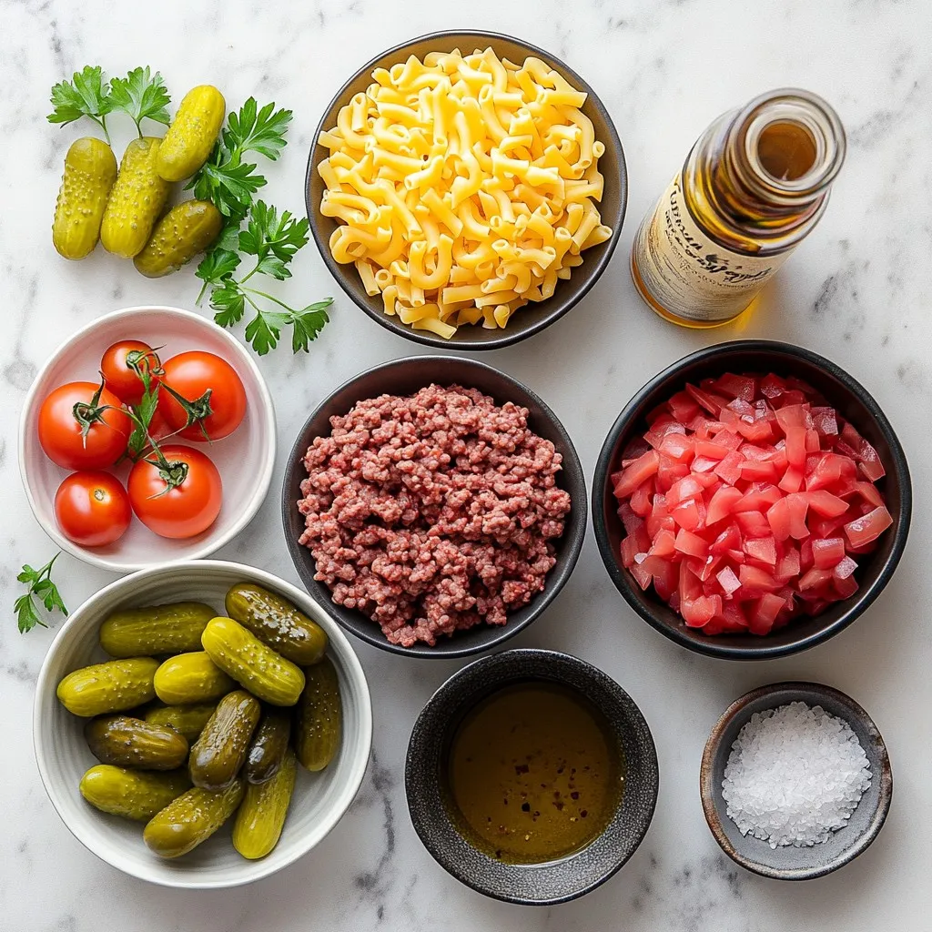 When making cheeseburger casserole, each ingredient plays a key role. Ground beef gives it that hearty base. The onion and garlic add a nice flavor. Cherry tomatoes and pickles bring freshness and a bit of zest. Shredded cheddar cheese melts beautifully and adds creaminess. Macaroni pasta acts as a comforting filler. Beef broth ties everything together, making it rich and savory. Worcestershire sauce and mustard add an extra punch. Finally, salt and pepper enhance all the flavors. Don’t forget the fresh parsley! It makes the dish look pretty and adds a touch of brightness.