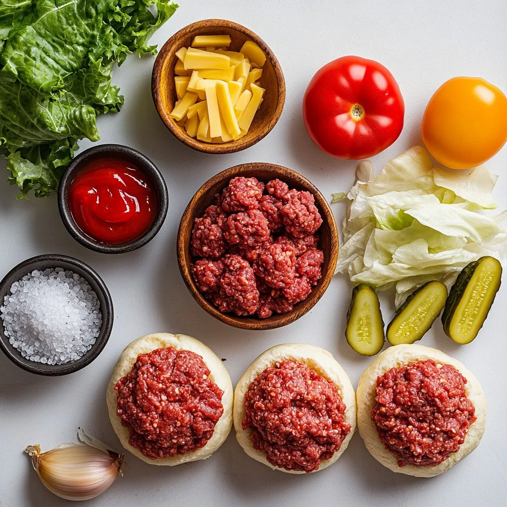 The first step in making cheeseburger sliders is gathering your ingredients. I recommend using an 80/20 blend of ground beef. This mix keeps your sliders juicy and flavorful. Garlic and onion powders add a nice kick. Don’t forget to season with salt and pepper.