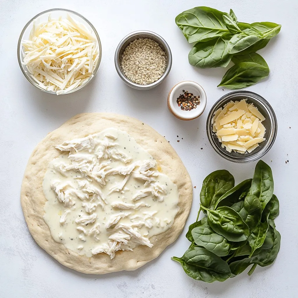 Each ingredient plays a key role. The flatbread acts as a base, holding everything together. The cooked chicken gives protein and heartiness. Alfredo sauce adds creaminess and rich flavor.