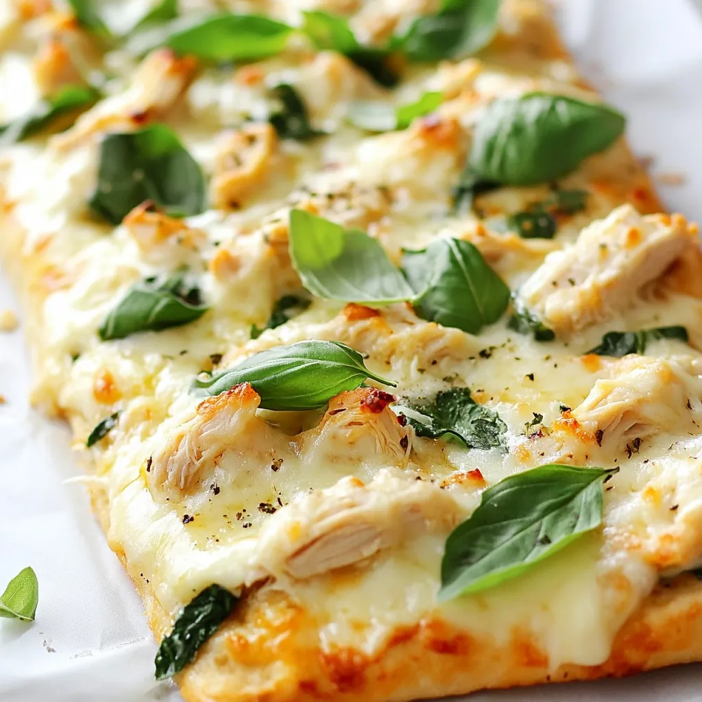 A delicious flatbread topped with creamy Alfredo sauce, shredded chicken, and fresh spinach, baked to perfection.