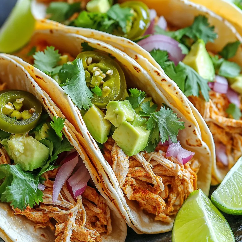 Now for the fun part—assembling the tacos! Take a warm tortilla and add a generous amount of shredded chicken on top. Then, sprinkle diced red onion and chopped cilantro over the chicken. Add sliced avocado for creaminess. If you like a little heat, toss on some pickled jalapeños. Finally, squeeze fresh lime juice over everything. Enjoy your delicious chicken street tacos!