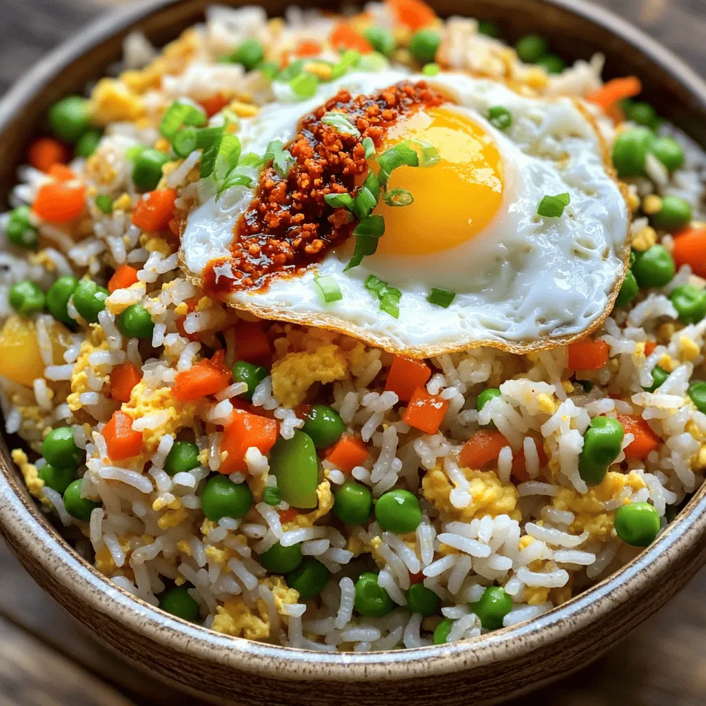 For a quick and tasty meal, gather these main ingredients: - 2 cups cold leftover cooked rice - 2 tablespoons chili crisp (store-bought or homemade) - 4 cloves garlic, minced - 1 small onion, finely chopped - 1 cup mixed vegetables (peas, carrots, bell peppers) - 2 green onions, chopped - 1 tablespoon soy sauce - 1 tablespoon sesame oil - Salt and pepper to taste - Optional: fried eggs for topping Using cold rice is key. It helps the dish stay fluffy and not sticky. You can use any mixed vegetables you like. Frozen ones work great too! The chili crisp adds a spicy kick. You can make your own if you want. Just blend oil, garlic, and chilies. - Heat the sesame oil in a skillet. - Sauté garlic and onions. Start by placing a large skillet on medium-high heat. Pour in the sesame oil. Let it warm up for a minute. Next, add the minced garlic and chopped onion. Stir them around for about 1-2 minutes. You want the garlic to smell nice and the onions to turn soft and clear. - Add mixed vegetables and cook. - Incorporate the cold rice. - Season with soy sauce and chili crisp. Now, toss in your mixed vegetables. This can be peas, carrots, or bell peppers. Cook them for about 2-3 minutes. They should get a bit tender but still crisp. After that, add in the cold leftover rice. Use a spatula to break up any clumps. Mix it all well with the veggies and garlic. Next, pour in the soy sauce and chili crisp. Stir everything together for another 2-3 minutes. This is where the flavors come alive! Taste it and sprinkle in some salt and pepper as needed. - Stir in green onions. - Serve hot with optional fried egg. Finally, after everything is heated through, stir in the chopped green onions. This adds a nice freshness. Cook for just one more minute. Now, it’s ready to serve! Dish the fried rice into bowls. If you want to make it even better, top it with a fried egg. Enjoy your meal! To make great fried rice, use cold, leftover rice. Fresh rice can be too sticky. Cold rice helps keep each grain separate. You can also adjust the amount of chili crisp. If you like it spicy, add more. If you prefer mild, use less. High heat is key when stir-frying. It cooks the rice fast and keeps it from getting soggy. Use a large skillet or wok. This gives the rice space to fry evenly. To prevent clumping, break up the rice as you add it. Use a spatula to mix well. Garnishing your dish makes it more inviting. Add a drizzle of chili crisp on top. This adds flavor and a burst of color. Chopped green onions also make a great garnish. For a complete meal, serve it with a fried egg on top. This adds richness and makes it look fancy. {{image_2}} You can easily change the vegetables in this dish. Try using broccoli or zucchini for a fresh twist. If you want protein, swap in chicken or tofu. Just cook them first before adding to the rice. These swaps keep the recipe fun and exciting. Want more heat? Add a pinch of red pepper flakes or extra chili crisp. If you crave different flavors, try using teriyaki or oyster sauce instead of soy sauce. This will change the taste and keep your taste buds guessing. For a vegan option, skip the fried egg topping. Use tofu or chickpeas for protein instead. If you need it gluten-free, choose a gluten-free soy sauce. These adaptations make this dish fit for everyone, no matter their diet. To keep your Chili Crisp Garlic Fried Rice fresh, place it in an airtight container. This keeps out air and moisture. Make sure to cool the rice to room temperature before sealing it. You can store it in the fridge for up to four days. If you want to keep it longer, consider freezing it. It can last in the freezer for up to three months. When it’s time to enjoy leftovers, you have a few options for reheating. The best method is to use a skillet. Heat the skillet over medium heat, then add the rice. Stir it often to prevent burning. You can also use the microwave. Place the rice in a microwave-safe bowl and cover it with a damp paper towel. Heat in short bursts, stirring in between. This keeps the rice moist and fluffy. Add a splash of water if it seems dry. You can use fresh rice, but it affects the dish. Fresh rice contains more moisture. It can lead to clumping when you fry it. Leftover rice has dried out a bit, making it perfect for stir-frying. If using fresh rice, cool it on a tray for a bit. This helps reduce moisture. Chili crisp is a spicy oil with crunchy bits. It adds flavor and texture to dishes. You can find it at Asian markets or online. Popular brands include Lao Gan Ma and Fly by Jing. Each brand has its own unique flavor. Choose one that matches your taste! Yes, you can make chili crisp at home! It’s easy and fun. Here’s how: 1. Ingredients: - 1 cup oil (like vegetable or canola) - 1/2 cup dried chili flakes - 1/4 cup minced garlic - 1/4 cup minced onion - Salt to taste 2. Instructions: - Heat the oil in a pan over low heat. - Add the garlic and onion. Cook until golden. - Stir in the chili flakes and salt. - Cook for about 5-10 minutes. - Let it cool and store in a jar. This homemade version gives you full control over the spice level! In this article, we explored how to make a tasty fried rice dish. We covered the key ingredients, preparation steps, and cooking techniques. I shared tips for perfecting your fried rice and offered easy variations. Storage info and FAQs help you manage leftovers and ingredients. Fried rice is simple, quick, and fun to make. With a few easy swaps, you can customize it to your taste. Enjoy this dish any time as a meal or a side!