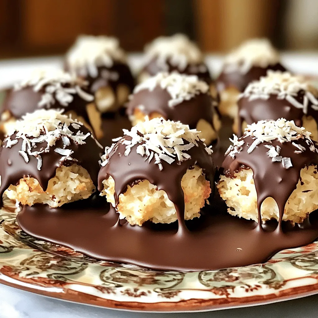 To make these tasty chocolate coconut macaroon bites, gather these key items: - 2 cups unsweetened shredded coconut - 1/2 cup sweetened condensed milk - 1/4 cup unsweetened cocoa powder - 1 teaspoon vanilla extract - 1/4 teaspoon sea salt - 1/2 cup dark chocolate chips - 1 tablespoon coconut oil These ingredients create the perfect balance of sweet and rich flavors. The unsweetened coconut adds texture, while the cocoa powder gives a deep chocolate taste. You can add a few extra ingredients to make your bites even more delightful: - A pinch of cinnamon for warmth - Chopped nuts for crunch - Mini chocolate chips for more chocolate flavor These optional touches can personalize your macaroons and make them unique. If you have dietary needs, here are some great substitutes: - Use sweetened condensed coconut milk for a dairy-free option. - Swap dark chocolate chips for dairy-free chocolate chips. - Replace shredded coconut with finely chopped almonds for a different texture. These substitutes ensure everyone can enjoy these treats without worry. First, preheat your oven to 325°F (160°C). This step warms up the oven for baking. Next, line a baking sheet with parchment paper. This paper helps keep the bites from sticking. In a large mixing bowl, add the shredded coconut, sweetened condensed milk, cocoa powder, vanilla extract, and sea salt. Mix well. You want the coconut to be fully coated. This makes sure every bite is delicious. Now, use your hands or a small cookie scoop to form the mixture into balls. Aim for about 1 inch in diameter. Place the balls on the baking sheet, leaving space between each. This gives them room to expand while baking. Bake them for 15-18 minutes. They should turn golden brown on top. After baking, let them cool completely on the sheet. For the chocolate, combine dark chocolate chips and coconut oil in a microwave-safe bowl. Microwave in 30-second intervals. Stir in between each interval until smooth. Once melted, dip each macaroon bite into the chocolate. Let the excess chocolate drip off before placing them back on the parchment. Finally, place the baking sheet in the refrigerator for about 15 minutes. This helps the chocolate set. For a fun touch, you can sprinkle extra shredded coconut or drizzle more melted chocolate on top before serving. Your chocolate coconut macaroon bites are now ready to enjoy! To make the best chocolate coconut macaroon bites, start with fresh ingredients. Use unsweetened shredded coconut for a rich coconut flavor. Measure the sweetened condensed milk carefully. It binds the mixture well. Line your baking sheet with parchment paper. This step helps the bites release easily after baking. Space the bites apart on the sheet. This allows even baking and helps them stay round. Mix your ingredients thoroughly. When combining coconut, cocoa powder, and milk, make sure all coconut is coated. If the mixture feels too dry, add a bit more condensed milk. If it feels too wet, add a touch more cocoa powder or coconut. Use your hands to form even balls, about one inch wide. This size helps them bake evenly. Serve your chocolate coconut macaroon bites on a pretty plate. For a fun touch, sprinkle shredded coconut on top. You can also drizzle extra melted chocolate over the bites for a classy look. These bites pair well with coffee or tea. For a festive touch, add colorful sprinkles or nuts on top before they set. Enjoy sharing these tasty treats with friends! {{image_2}} You can change the taste of your chocolate coconut macaroon bites with fun flavors. Here are some ideas: - Mint Chocolate: Add 1/2 teaspoon of mint extract to the mixture. - Almond Joy: Mix in chopped almonds and a bit of almond extract. - Coconut Lime: Swap vanilla for lime juice and zest for a fresh twist. - Peanut Butter: Stir in 1/4 cup of peanut butter for a nutty flavor. Each variation brings a new joy to these tasty treats! You can easily make these bites fit your diet: - Vegan: Use coconut cream instead of sweetened condensed milk. - Gluten-Free: This recipe is already gluten-free, so enjoy it! - Nut-Free: Skip any nuts in flavor variations to keep it safe. These options let everyone enjoy this treat! Toppings can make your bites even more special. Here are some ideas: - Coconut Flakes: Sprinkle extra shredded coconut on top for texture. - Chocolate Drizzle: Use melted white chocolate or dark chocolate for a drizzle. - Chopped Nuts: Add crushed nuts for a crunchy finish. - Sea Salt: A pinch of sea salt enhances the chocolate flavor. Try these toppings to make your bites look and taste amazing! To keep your chocolate coconut macaroon bites fresh, store them in an airtight container. Place a piece of wax paper between layers to prevent sticking. Keep the container in a cool, dry place, away from direct sunlight. These bites stay fresh for up to one week at room temperature. If you want to keep them longer, you can freeze them. Place the bites on a baking sheet, then freeze for about an hour. Once frozen, transfer them to a freezer-safe bag. They can last for up to three months in the freezer. If you want to enjoy them warm, you can reheat the bites. Place them in the microwave for about 10-15 seconds. Check to make sure they don't melt too much. Enjoy them warm for a cozy treat! Macaroons are chewy coconut treats, while macarons are delicate meringue cookies. Macaroons have a denser texture, often made with shredded coconut. Macarons are lighter and filled with cream or ganache. Both are delicious but are quite different in taste and look. Yes, you can use sweetened shredded coconut. It will add extra sweetness to your bites. Just be sure to adjust the sweetened condensed milk if you use sweetened coconut. This change will make your macaroons even more delightful. To make sugar-free macaroon bites, use sugar-free sweetened condensed milk. You can find this at many grocery stores. You can also use a sugar substitute in place of cocoa powder. This way, you keep the great flavor wit