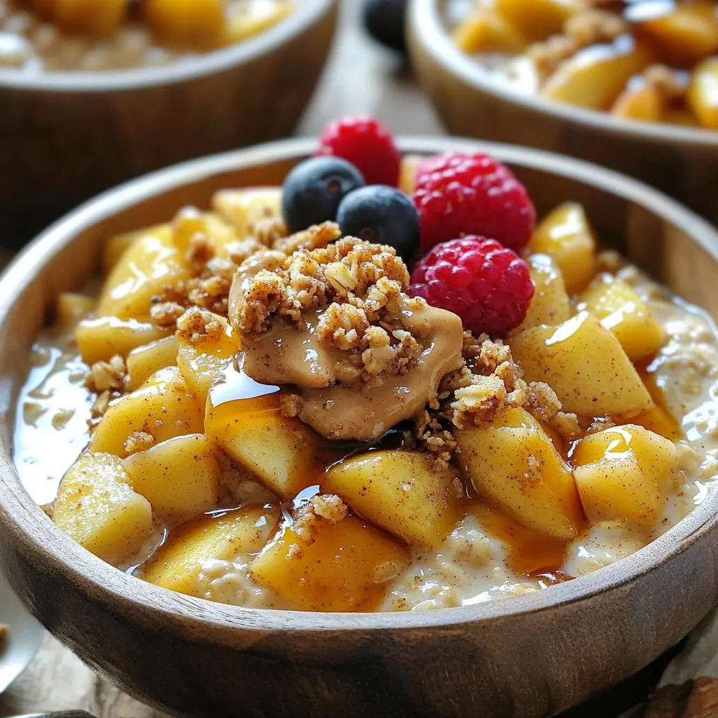 To create a delicious Cinnamon Apple Crumble Breakfast Bowl, gather these key ingredients: - 2 large apples, peeled and diced - 1 teaspoon ground cinnamon - 2 tablespoons maple syrup - 1 cup rolled oats - ½ cup almond milk (or any milk of choice) - 1 tablespoon chia seeds - ¼ cup walnuts, chopped - 2 tablespoons almond butter (or peanut butter) - 1 tablespoon coconut oil - 1 tablespoon brown sugar (or coconut sugar) - A pinch of salt - Fresh berries (for topping, optional) These ingredients blend well to create a warm, comforting breakfast. The apples provide a sweet and tart base. Ground cinnamon adds a warm spice that makes everything feel cozy. Maple syrup brings natural sweetness, while rolled oats offer a hearty base. You can choose almond milk or any milk you like. Chia seeds boost nutrition and help thicken the oatmeal. The walnuts add a nice crunch, and almond butter gives a creamy touch. Coconut oil adds richness and flavor. Brown sugar enhances sweetness, and a pinch of salt balances the taste. Finally, fresh berries on top add a pop of color and flavor. This mix of ingredients makes each bite a delightful experience. Enjoy the fun of creating this breakfast bowl! Start by melting 1 tablespoon of coconut oil in a medium saucepan over medium heat. Once the oil is melted, add 2 large diced apples to the pan. Stir in 1 teaspoon of ground cinnamon and 2 tablespoons of maple syrup. This mix gives the apples a sweet, warm flavor. Cook the apples for about 5 to 7 minutes. Stir them often until they become soft and caramelized. If you want extra caramelization, let them cook a bit longer. Just keep an eye on them! In another pot, combine 1 cup of rolled oats, ½ cup of almond milk, 1 tablespoon of chia seeds, and a pinch of salt. Bring the mix to a gentle boil on medium heat. Once it starts boiling, lower the heat to low and let it simmer. Stir occasionally for about 5 minutes. You want the oatmeal to be creamy but not too thick. If it gets too thick, you can add a splash more almond milk. While the oatmeal cooks, grab a small bowl. Mix ¼ cup of chopped walnuts with 1 tablespoon of brown sugar. This will create a crunchy topping. For the best crunch, use a fork to break up any big clumps of walnuts. You want even bits for the perfect texture. Once the oatmeal is ready, spoon it into serving bowls. Layer the caramelized apples on top. Then, sprinkle the walnut crumble over everything. For a finishing touch, add a dollop of 2 tablespoons of almond butter on each bowl. If you like, you can also add fresh berries on top for color and flavor. This makes your breakfast bowl look and taste amazing! To get the best caramelized apples, you need the right heat. Start cooking on medium heat. This will help the apples soften but not burn. Stir them often. Cook for about 5 to 7 minutes. You want them soft and golden. If they cook too fast, lower the heat. A gentle simmer works wonders for flavor. For creamy oatmeal, almond milk is your friend. Use ½ cup for this recipe. If you want thicker oatmeal, reduce the milk slightly. If you like it runnier, add more milk. Stir it while it cooks to keep it smooth. Let it simmer for about 5 minutes. This helps the oats absorb the milk well. For a pretty breakfast bowl, use rustic bowls. Start with a base of oatmeal. Then, layer the caramelized apples on top. Next, sprinkle the walnut crumble over everything. A dollop of almond butter adds richness. For color, add fresh berries on top. A light sprinkle of cinnamon finishes it off nicely. This makes your bowl not just tasty but also beautiful! {{image_2}} You can swap out maple syrup for honey or agave syrup. These sweeteners add a nice flavor. If you have nut allergies, use sunflower seed butter instead of almond or peanut butter. This keeps the dish safe while still tasty. Try adding sliced bananas, strawberries, or blueberries on top. These fruits add freshness and flavor. You can also use cashew butter or tahini as different nut butter options. Each adds a unique twist to your bowl. To keep it vegan, ensure your milk choice is plant-based. Almond milk works great, but oat milk can be yummy too. For gluten-free options, choose certified gluten-free oats. They are safe and full of fiber, making your breakfast bowl wholesome and hearty. To keep your Cinnamon Apple Crumble Breakfast Bowl fresh, store it in an airtight container. Place it in the fridge if you plan to eat it within two days. This keeps the oats and apples tasty. If you want to keep it longer, consider freezing components instead. When reheating, do it gently. Use a microwave or a saucepan over low heat. Add a splash of almond milk if it seems dry. Stir often, so it warms evenly. This helps maintain a good texture. You want soft oats and tender apples, not mushy. You can freeze both the apples and the oats. To freeze apples, cool them first. Then, place them in a freezer-safe bag. For oats, let them cool too, then store in a separate bag. When ready to eat, thaw overnight in the fridge before reheating. This method preserves flavor and texture well. I recommend using sweet apples like Fuji or Gala. They add natural sweetness and flavor. Tart apples like Granny Smith can work too, but they will give a different taste. Choose based on your preference for sweet or tangy. Yes, you can! Prepare the apples and oatmeal in advance. Store them in the fridge. When you're ready, just heat them up. This makes busy mornings easier. You can add vanilla extract or nutmeg for extra flavor. If you like it sweeter, add more maple syrup. For a nutty taste, try different nuts or seeds in the crumble. Absolutely! This breakfast bowl is great for meal prep. You can make multiple servings. Just store them in containers. It stays fresh for a few days in the fridge. Yes, you can boost the protein! Add Greek yogurt or protein powder to the oatmeal. Chia seeds also add protein and fiber. This makes your breakfast more filling and nutritious. This breakfast bowl combines 