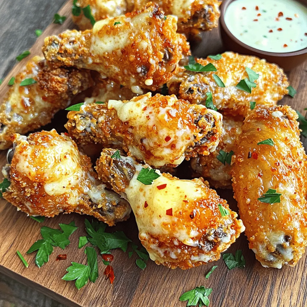 - 2 pounds chicken wings - 1 teaspoon baking powder - 1 teaspoon salt - 1 teaspoon black pepper - 1 tablespoon garlic powder - 1/2 cup grated Parmesan cheese - 1/4 cup unsalted butter, melted - 1 tablespoon olive oil - 2 cloves fresh garlic, minced - 1 tablespoon fresh parsley, chopped (for garnish) - Red pepper flakes for added heat Each ingredient plays a key role in making these wings rich in flavor and texture. The chicken wings serve as the base, while the baking powder helps them crisp up beautifully. Salt and black pepper enhance the natural taste of the chicken. Garlic powder adds a savory kick that pairs perfectly with Parmesan. For flavor, grated Parmesan cheese brings a salty richness. Unsalted butter and olive oil create a luscious sauce, coating the wings perfectly. Fresh garlic adds depth, while parsley gives a fresh contrast. If you like some heat, red pepper flakes can spice things up. Gather these ingredients, and you’re ready to create a dish that is sure to impress! - Preheat your oven to 425°F (220°C). - Line a baking sheet with parchment paper for easy cleanup. - In a large bowl, mix the chicken wings with 1 teaspoon of baking powder, 1 teaspoon of salt, 1 teaspoon of black pepper, and 1 tablespoon of garlic powder. - Toss the wings until they are evenly coated in the seasonings. - Lay the wings in a single layer on the baking sheet. Make sure they do not touch each other. - This helps the wings cook evenly and get crispy. - Bake for 25-30 minutes. Flip the wings halfway through to ensure both sides turn golden brown and crispy. - While the wings bake, melt 1/4 cup of unsalted butter in a small bowl. - Add 1 tablespoon of olive oil, 2 cloves of minced garlic, and 1/2 cup of grated Parmesan cheese. - Mix well until everything is combined. - When the wings are done baking, take them out of the oven. - Toss the crispy wings in the garlic Parmesan sauce until they are well coated. - Return the sauced wings to the oven for 5-7 minutes. This helps the cheese melt slightly and stick to the wings. To make your wings extra crispy, use baking powder. It helps to dry out the skin. This extra crunch makes a big difference. Arrange your wings in a single layer on the baking sheet. If they touch, they may steam instead of crisp. Give each wing some space to cook evenly. You can adjust the garlic and cheese levels to suit your taste. If you love garlic, add a bit more. For a sharper taste, increase the Parmesan. Want some heat? Sprinkle red pepper flakes on your wings before baking. This adds a nice kick that many enjoy. For dipping sauces, ranch and blue cheese are classic choices. They pair well with the garlic Parmesan flavor. When serving, use a large platter. Garnish the wings with chopped parsley and lemon wedges. This adds color and freshness to your dish. {{image_2}} You can easily change the flavor of your wings. For a spicy kick, try spicy garlic Parmesan wings. Just add red pepper flakes to the garlic Parmesan sauce. This will give your wings a nice heat that balances well with the cheese. If you prefer something bright and fresh, go for lemon garlic Parmesan wings. Squeeze fresh lemon juice into the sauce before tossing the wings. The citrus adds a zesty punch that makes the wings even more delicious. You have different ways to cook these wings. The air fryer is a great method if you want quick and crispy wings. Just toss the wings in the air fryer at 400°F for about 25 minutes. They turn out crispy with less oil. If you prefer the oven, follow the original recipe. Baking wings at 425°F gives them a golden color and a crunchy skin. For a smoky flavor, grilling is another option. Grill the wings on medium heat for about 20 minutes. Be sure to turn them often to avoid burning. The grill adds a unique taste that pairs well with garlic and Parmesan. Wings are perfect with some tasty sides. Try serving them with celery and carrot sticks for crunch. A side of coleslaw adds a creamy contrast that complements the wings well. For a refreshing option, serve a simple green salad. It balances the richness of the wings. When it comes to drinks, cold beer is a classic choice. A light lager or a pale ale pairs nicely. If you prefer non-alcoholic drinks, a lemon-lime soda brings a refreshing touch. To keep your crispy garlic Parmesan wings fresh, store them in an airtight container. Make sure to let them cool completely before sealing. This helps prevent sogginess. In the fridge, they stay fresh for about 3-4 days. If you want to keep them longer, consider freezing. When you are ready to enjoy your wings again, reheating is key. The best way is to use the oven. Preheat it to 350°F (175°C). Place the wings on a baking sheet. Heat them for about 10-15 minutes. This method keeps the wings crispy and tasty. You can also use an air fryer if you have one. It works great for reheating without losing that crunch. If you want to freeze cooked wings, let them cool completely first. Place them in a freezer-safe bag or container. Make sure to remove as much air as possible. This way, they won't get freezer burn. Cooked wings can stay good for up to 3 months in the freezer. To thaw, move them to the fridge overnight. Then, follow the reheating steps to enjoy them crispy once again. I cook the wings at 425°F (220°C) for 25-30 minutes. Flip them halfway to get even crispiness. The wings should turn golden brown and crispy. This cooking time works well for about two pounds of wings. Yes, you can use frozen wings. Just make sure to thaw them first. You can do this in the fridge overnight or in cold water for a quicker method. After thawing, follow the same steps as fresh wings. I love to pair these wings with ranch or blue cheese dressing. You can also serve them with celery and carrot sticks. For a tasty side, try some crispy fries or a fresh salad. These pairings balance the rich flavor of the wings. We've covered how to make crispy chicken wings that are packed with flavor. You learned abo