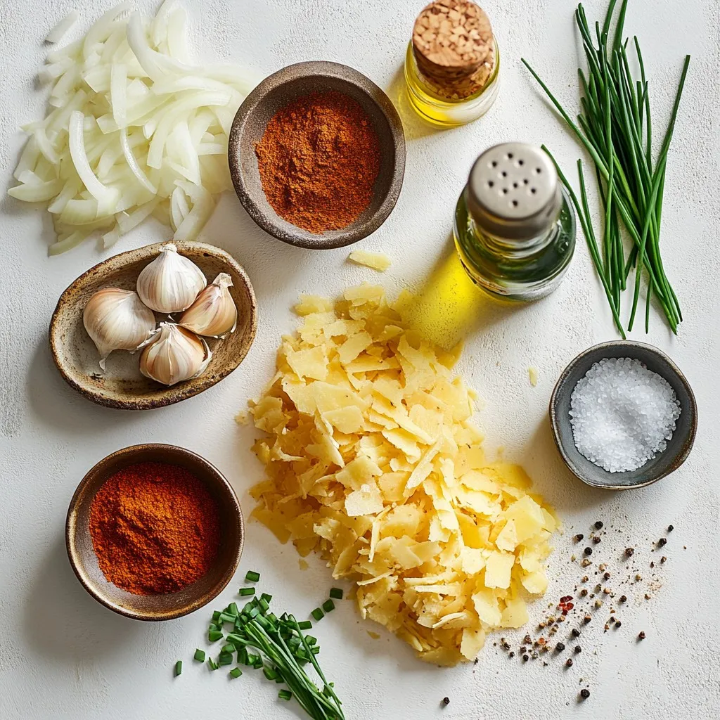 Each ingredient plays a key role in flavor and texture. The russet potatoes give a nice base. The onion adds sweetness and depth. Garlic powder and smoked paprika bring warm notes. Salt and pepper enhance the overall taste. Olive oil helps with crispiness while cornstarch can boost it even more. Finally, fresh chives add a pop of color and fresh flavor.