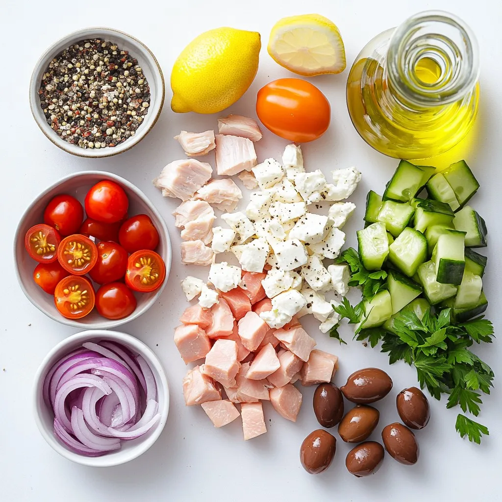 These main ingredients form the heart of your feta chicken salad. The cooked chicken provides protein, while cherry tomatoes add sweetness. The cucumber gives a fresh crunch, and the red onion adds a mild bite. Together, they create a tasty base for your salad.