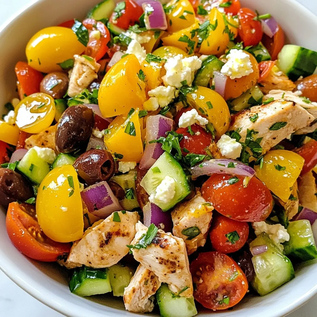A refreshing salad featuring diced chicken, feta cheese, and a medley of fresh vegetables.