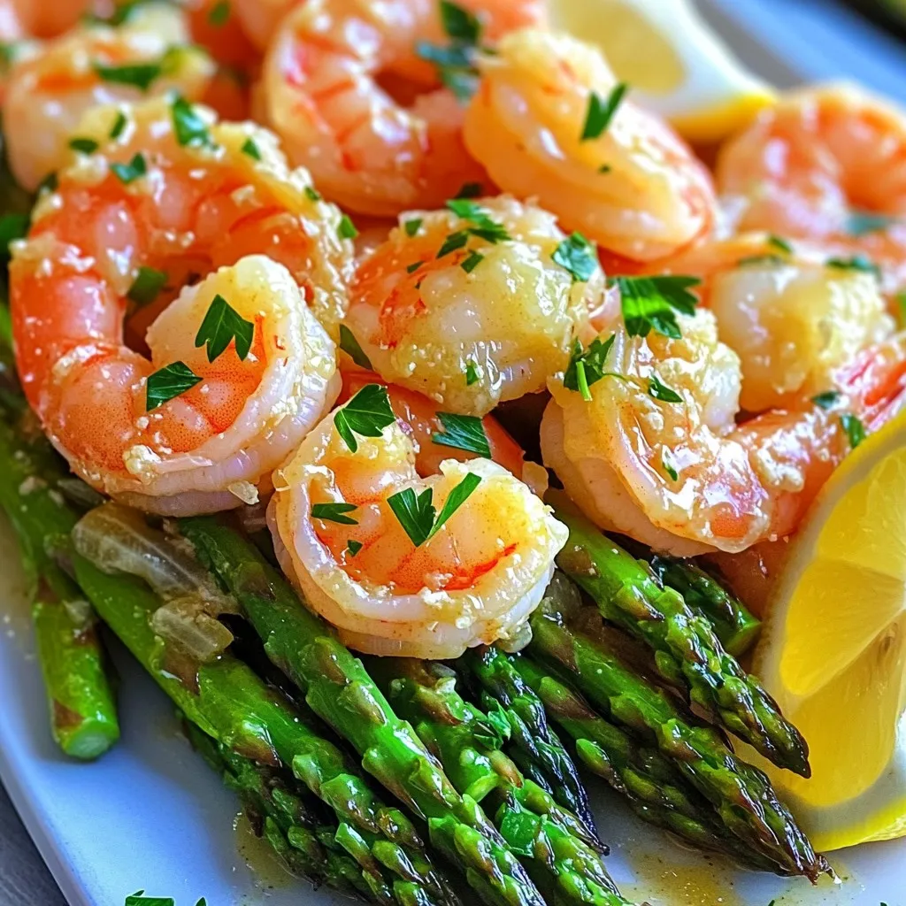 To make Garlic Butter Shrimp & Asparagus, you need just a few fresh items. Here’s what you’ll gather: - 1 pound large shrimp, peeled and deveined - 1 bunch asparagus, trimmed and cut into 2-inch pieces - 4 tablespoons unsalted butter, melted - 4 cloves garlic, minced - 1 teaspoon lemon zest - 2 tablespoons fresh lemon juice - 1 teaspoon paprika - 1 teaspoon dried oregano - Salt and pepper to taste - 1 tablespoon olive oil - Fresh parsley, chopped for garnish - Lemon wedges for serving Each ingredient plays a key role. The shrimp gives a sweet and tender texture. Asparagus adds a nice crunch and fresh flavor. Garlic and butter create a rich sauce that ties it all together. Lemon juice and zest brighten the dish. Paprika and oregano add depth with a touch of warmth. Gather these ingredients before you start. It makes cooking easier and more fun! You’ll love how simple and tasty this meal can be. Plus, it’s quick to prepare, which is perfect for busy weeknights. Enjoy the process of creating this delightful dish! - Preheat your oven to 400°F (200°C). - Line a baking sheet with parchment paper or aluminum foil. First, you need to get the oven hot. This helps cook everything fast and keeps it juicy. The lined baking sheet makes cleanup easy. - Mix melted butter, minced garlic, and spices in a bowl. Next, melt the butter in a bowl. Add the minced garlic, lemon zest, lemon juice, paprika, oregano, salt, and pepper. Mix it well. This garlic butter is the star of the dish. It gives rich flavor to both the shrimp and the asparagus. - Coat shrimp in garlic butter and let marinate. - Toss asparagus with olive oil, salt, and pepper. Now, add the shrimp to the garlic butter mix. Make sure each shrimp gets coated well. Let them sit for about 10 minutes. This allows the flavors to soak in. In another bowl, toss the asparagus with olive oil, salt, and pepper. This adds taste and helps it roast nicely. - Spread asparagus on one side, shrimp on the other. - Pour remaining garlic butter over shrimp and asparagus. Spread the asparagus on one side of the sheet pan. Place the shrimp on the other side. Pour any leftover garlic butter over both. This adds more moisture and flavor while baking. - Bake for 12-15 minutes until done. - Garnish and serve. Place the pan in the oven and bake for 12-15 minutes. The shrimp will turn pink and opaque. The asparagus should be tender-crisp. Once done, take it out and sprinkle fresh parsley on top. Serve with lemon wedges for a zesty kick. Enjoy this simple yet delicious dish! To check if your shrimp are done, look for a bright pink color. They should also curl slightly. If they are white and firm, they are overcooked. Marination is key. Letting shrimp sit in the garlic butter mix for 10 minutes adds great flavor. This short time gives the shrimp a chance to absorb the garlic and lemon zest. You can add a pinch of red pepper flakes for spice. Fresh herbs, like thyme or basil, also work well. These can give your dish a fresh twist. For butter, I recommend using unsalted butter. It lets you control the saltiness. You can also try herbed butter for extra flavor. Serve the shrimp and asparagus on a big platter. Sprinkle fresh parsley on top for color. Lemon wedges add a nice touch and bring brightness. For drinks, a chilled white wine pairs nicely. A light salad or rice works as a great side dish. This adds balance to your meal. {{image_2}} You can add many different veggies to this dish. Consider bell peppers, zucchini, or cherry tomatoes. These options mix well with shrimp. You can also use seasonal veggies like green beans in spring or butternut squash in fall. Get creative based on what you like! If you need a gluten-free version, this recipe is already safe. Just make sure your butter is gluten-free. For low-carb or keto-friendly options, skip the asparagus and try cauliflower or broccoli. These choices keep the meal light and tasty while fitting your diet. If you want to switch the shrimp, look for scallops or chicken. Both options cook well and taste great with garlic butter. For those who avoid butter, try coconut oil or vegan butter. These substitutes keep your dish rich and flavorful. To keep your Garlic Butter Shrimp and Asparagus fresh, place leftovers in an airtight container. Make sure to cool the dish to room temperature first. Store it in the fridge for up to three days. This helps keep the shrimp and asparagus tasty. When you're ready to enjoy your leftovers, reheat them gently. You can use a microwave or the oven. If using a microwave, heat in short bursts. Stir in between to warm evenly. If using an oven, preheat it to 350°F (175°C). Place the leftovers in a baking dish and cover it with foil. Bake for about 10-15 minutes. You can freeze Garlic Butter Shrimp and Asparagus for future meals. First, let the dish cool completely. Then, place it in a freezer-safe container. It can last up to three months in the freezer. To thaw, move it to the fridge overnight. For quicker thawing, place it in cold water. After thawing, reheat as described above for the best results. I suggest using large shrimp, around 16-20 count per pound. They offer great flavor and texture. If you want a sweeter taste, go for wild-caught shrimp. Farmed shrimp works well too, but wild shrimp packs a bigger punch. Always buy shrimp that is peeled and deveined for convenience. Yes, you can use frozen shrimp! Just make sure to thaw them first. Place the shrimp in a bowl of cold water for about 15 minutes. This helps them cook evenly. After thawing, pat them dry before tossing in the garlic butter mix. This step prevents excess water from making your dish soggy. Look for a few signs to check doneness. The shrimp should turn pink and opaque. They should also curl into a loose "C" shape. If they look firm and have no gray spots, they are ready. Overcooked shrimp become tough and rubbery, so watch closely! This dish pairs well with several sides. Consider serving it over rice for a filling 