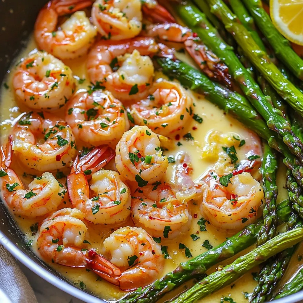 - 1 lb large shrimp, peeled and deveined - 1 bunch asparagus, trimmed and cut into 2-inch pieces - 4 tablespoons unsalted butter - 3 cloves garlic, minced - 1 teaspoon red pepper flakes (adjust to taste) - Juice of 1 lemon - Salt and pepper to taste - 2 tablespoons fresh parsley, chopped (for garnish) To make Garlic Butter Shrimp & Asparagus, gather these fresh ingredients. Freshness matters. Start with 1 pound of large shrimp. Make sure they are peeled and deveined for easy cooking. Next, grab a bunch of asparagus. Trim the ends and cut them into 2-inch pieces. This size helps them cook evenly. You will also need 4 tablespoons of unsalted butter. Butter adds rich flavor to your dish. For seasoning, use 3 cloves of minced garlic. This gives a strong taste. Add red pepper flakes for some heat. Start with 1 teaspoon, but feel free to adjust to your liking. Don't forget the juice of 1 lemon. It brightens the dish. Lastly, have salt and pepper ready for seasoning. For garnish, chop 2 tablespoons of fresh parsley. It adds color and freshness to your meal. - Melt 2 tablespoons of butter in a large skillet over medium heat. - Add minced garlic and red pepper flakes. Sauté for about 1 minute until fragrant. - Now, add the shrimp to the skillet. Season with salt and pepper. - Cook the shrimp for 2-3 minutes on each side. You want them pink and opaque. - Once done, remove the shrimp from the skillet and set aside. - In the same skillet, add the remaining 2 tablespoons of butter. - Once melted, add the asparagus cut into 2-inch pieces. - Sauté the asparagus for about 5-7 minutes. Cook until they are tender yet still crisp. - Return the cooked shrimp to the skillet with the asparagus. - Squeeze the juice of one lemon over the mixture. Toss everything to coat well. - Allow to cook for another 2 minutes to warm through. - Remove from heat and sprinkle with fresh parsley for garnish. Adjust seasoning if needed. - Use fresh shrimp for the best flavor. Fresh shrimp tastes sweet and juicy. - Adjust red pepper flakes to your spice preference. Start with a little and add more if needed. - Serve over rice or pasta for a complete meal. Both options soak up the sauce well. - Pair with a crisp white wine. A chilled Sauvignon Blanc complements the dish perfectly. {{image_2}} You can change the main protein for this dish. Substitute shrimp with chicken or tofu. Chicken gives a nice flavor. Tofu is a great option for plant-based eaters. Both work well with garlic butter. You can also use other vegetables. Try bell peppers for a sweet touch. Broccoli adds great crunch, too. These swaps keep the dish fresh and fun. Want to add more flavor? A splash of white wine makes a big difference. Add it just before you finish cooking. The wine creates a rich taste that blends well with the garlic. You can also mix in different herbs. Basil adds a sweet note, while cilantro gives it a fresh twist. Experiment with these herbs to find your favorite flavor. Store leftovers in an airtight container in the fridge. This helps keep shrimp and asparagus fresh. They can last for up to three days. Be sure to seal the container well to avoid any odors from mixing. To reheat, gently warm the dish in a skillet. This method keeps the shrimp tender and the asparagus crisp. Heat over low to medium heat, stirring often. If you prefer the microwave, place the dish in a microwave-safe bowl. Cover it with a lid or wrap to avoid drying out. Heat for about one to two minutes, checking to ensure even warming. Cook shrimp for about 2-3 minutes on each side. This timing works well for large shrimp. They will turn pink and opaque when done. If your shrimp are smaller, reduce the time slightly. Always check that they are fully cooked to ensure safety. Yes, you can make parts of this dish ahead. Cook the shrimp and asparagus separately. Store them in the fridge for up to two days. When ready to serve, just reheat them in a skillet. Add lemon juice and parsley to freshen the flavors. Serve this dish with rice or pasta for a full meal. A crisp salad pairs nicely, too. For drinks, try a chilled white wine or sparkling water. These options balance the rich flavors of the shrimp and asparagus well. You learned how to make a tasty Garlic Butter Shrimp and Asparagus dish. Starting with fresh ingredients, you sautéed shrimp and asparagus for a quick meal. Tips included swapping shrimp for chicken or adding extra veggies. Remember, leftovers store well and can be reheated easily. Finally, enjoy this dish with rice or a glass of white wine. With these steps, you can impress family or friends with a great dinner. Dive into cooking with the confidence that you can make this meal shine.