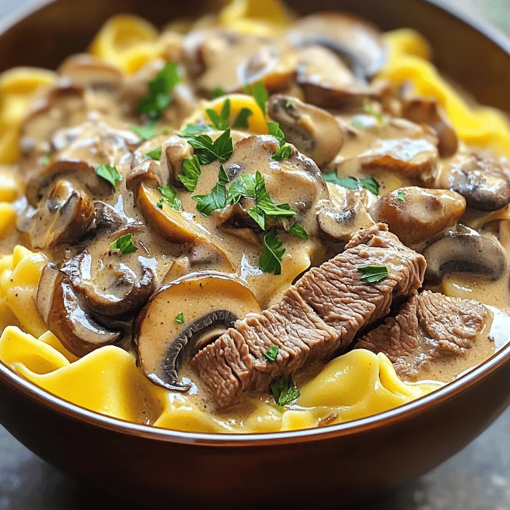 Plating is key for a beautiful beef stroganoff. I serve it in deep bowls. This keeps the sauce from spilling over. I always sprinkle fresh parsley on top. It adds a touch of color and freshness.