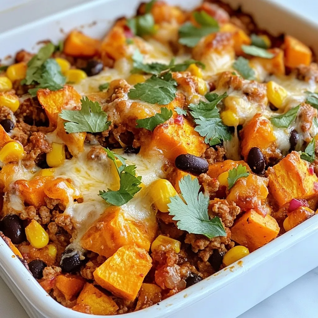 - 1 lb ground turkey - 2 medium sweet potatoes, peeled and diced - 1 can (15 oz) black beans, drained and rinsed - 1 onion, chopped - 2 cloves garlic, minced - 1 bell pepper, diced (red or yellow) - 1 cup corn (fresh or frozen) - 1 teaspoon smoked paprika - 1 teaspoon cumin - 1 teaspoon chili powder - Salt and pepper to taste - 1 cup chicken broth - Olive oil for sautéing - 1 cup shredded cheddar cheese for topping - Fresh cilantro for garnish Ground turkey serves as the lean protein in this dish. It cooks quickly and stays moist. Sweet potatoes add natural sweetness and a lovely texture. Black beans boost fiber and protein, making the meal filling. Onions and garlic bring depth to the flavor. Bell pepper adds crunch and color. The spices, like smoked paprika and cumin, create warmth and depth. Chicken broth keeps the casserole moist and ties everything together. Optional cheese can add a creamy finish, while fresh cilantro adds brightness. You can play with these ingredients to make the dish your own. Enjoy mixing and matching flavors! {{ingredient_image_1}} Prepping vegetables: Start by peeling and dicing the sweet potatoes. Chop the onion and bell pepper. Mince the garlic cloves. Make sure all pieces are about the same size for even cooking. Cooking ground turkey: In a large skillet, heat some olive oil over medium heat. Add the chopped onion and bell pepper. Sauté for about five minutes until they soften. Then, add the minced garlic and cook for one more minute. Next, add the ground turkey to the skillet. Cook it until it turns brown, which takes about six to eight minutes. Break the turkey apart with a spatula as it cooks. This helps it cook evenly. Combining ingredients in the skillet: Once the turkey is browned, season the mixture. Use smoked paprika, cumin, chili powder, salt, and pepper. Stir everything well to mix the flavors. Next, add the diced sweet potatoes, black beans, corn, and chicken broth. Mix until everything is well combined. Transferring to the baking dish: Take a greased 9x13 inch baking dish and pour the turkey mixture into it. Spread it out evenly. This helps it cook properly in the oven. Covering and baking: Cover the baking dish with aluminum foil. Place it in your preheated oven set at 375°F (190°C). Bake for 25 minutes. This gives the sweet potatoes time to soften. Adding cheese and final baking time: After 25 minutes, remove the foil. If you want cheese, sprinkle it on top. Bake for another 10 to 15 minutes. The casserole is done when the sweet potatoes are tender and the cheese is melted and bubbly. Let the casserole sit for a few minutes before serving. Add fresh cilantro on top if you like. Enjoy your hearty Ground Turkey Sweet Potato Casserole! To ensure your ground turkey cooks evenly, break it apart with a spatula while it cooks. This helps it brown well. Use medium heat for best results. Stir occasionally to avoid sticking. Sweet potatoes can be tricky. To avoid overcooking them, cut them into uniform pieces. This way, they cook at the same rate. Keep an eye on the casserole in the oven. You want them tender but not mushy. For spice adjustments, feel free to add more chili powder if you like heat. A pinch of cayenne can also enhance the flavor. If you want a milder taste, reduce the chili powder. Adding more vegetables can boost nutrition and flavor. Consider adding diced zucchini or spinach. They blend well with the other ingredients. You can also use different bell peppers for varied tastes. For serving, use a large spoon to scoop the casserole into bowls. This makes it easy for everyone to enjoy. You can serve it with a side salad for a fresh crunch. Garnishing ideas include a sprinkle of fresh cilantro on top. It adds color and a burst of flavor. You can also add a dollop of sour cream or Greek yogurt for creaminess. Pro Tips Ingredient Substitution: If you prefer, you can substitute ground turkey with lean ground chicken or beef for a different flavor profile. Adding More Veggies: Feel free to add more vegetables like zucchini or spinach to boost the nutrition content of the casserole. Make It Spicy: For those who enjoy a kick, add diced jalapeños or a pinch of cayenne pepper to the turkey mixture. Storing Leftovers: This casserole can be stored in the refrigerator for up to 3 days or frozen for up to a month. Reheat thoroughly before serving. {{image_2}} You can change the ground turkey in the casserole. Try ground chicken or beef. Both will work well. If you want a lighter option, use ground turkey breast. It has less fat but still adds great flavor. You can also use different beans. Black beans are great, but you can try pinto or kidney beans. These will change the taste but still keep it hearty. Experiment with your favorite beans to find the mix you enjoy! If you need gluten-free options, this recipe is easy to adapt. All the ingredients are naturally gluten-free. Just make sure to check your spices and broth for any hidden gluten. For a vegetarian version, skip the ground turkey. You can add more beans or lentils instead. Swap in extra veggies like zucchini or mushrooms. This way, you keep the casserole filling and delicious without the meat. You can change the spices for a new flavor profile. If you love heat, add cayenne pepper or red pepper flakes. For a smoky taste, use more smoked paprika. Adjust the spices to match your taste buds. Adding sauces can also enhance the dish. Try a splash of hot sauce for heat or barbecue sauce for sweetness. You can even mix in a bit of salsa for a fresh twist. Toppings like sour cream or avocado can add creaminess and flavor, too! To keep your Ground Turkey Sweet Potato Casserole fresh, follow these steps: - Refrigeration guidelines: Place the casserole in an airtight container. It can stay in the fridge for up to 3-4 days. Make sure to cool it down first before sealing. - Freezing instructions: If you want to freeze it, wrap the casserole tightly in plastic wrap and then foil. It can last in the 