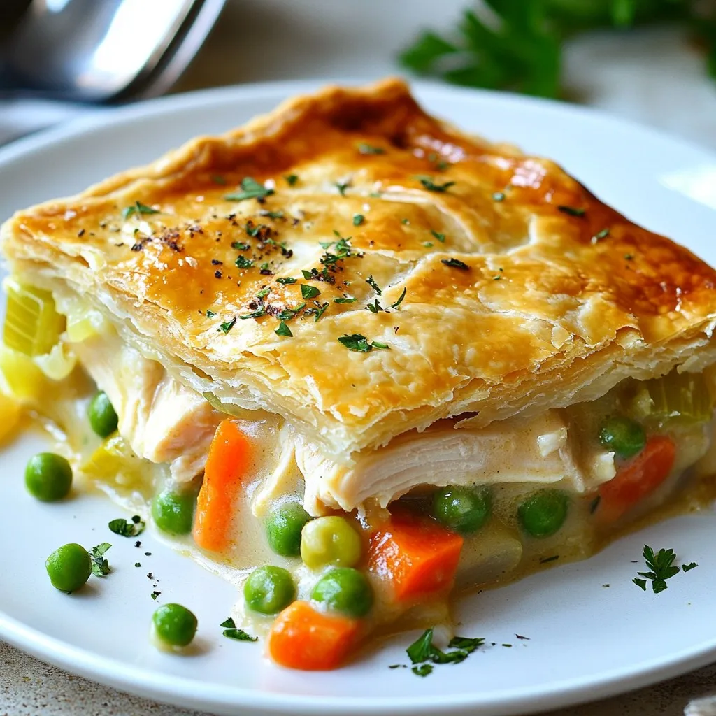 Serve slices of the pot pie on individual plates, garnished with a sprinkle of fresh parsley for a pop of color.