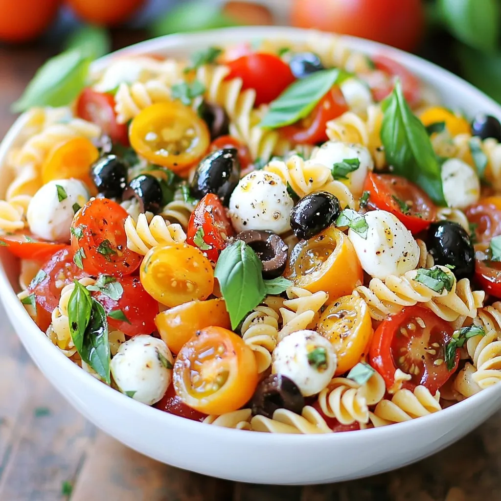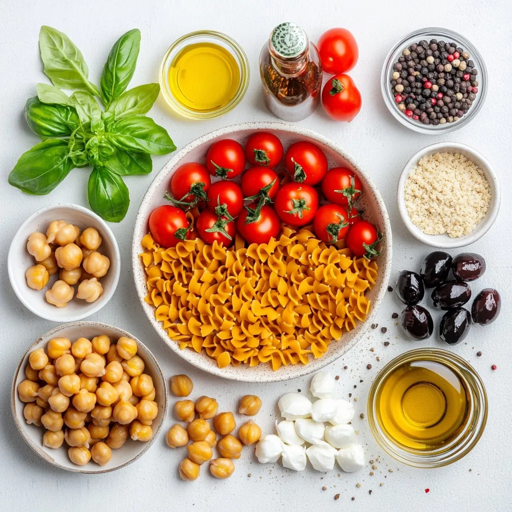 The main ingredients of this salad provide great nutrition. Whole wheat pasta or protein-infused pasta adds fiber and keeps you full. Fresh vegetables like cherry tomatoes and bell peppers add color and vitamins. Chickpeas boost protein, while mozzarella gives a creamy bite. Black olives add a salty touch, and fresh basil brightens the dish. If you want extra protein, include grilled chicken.