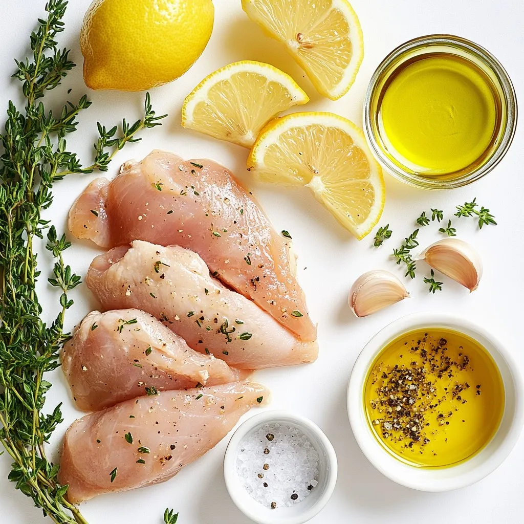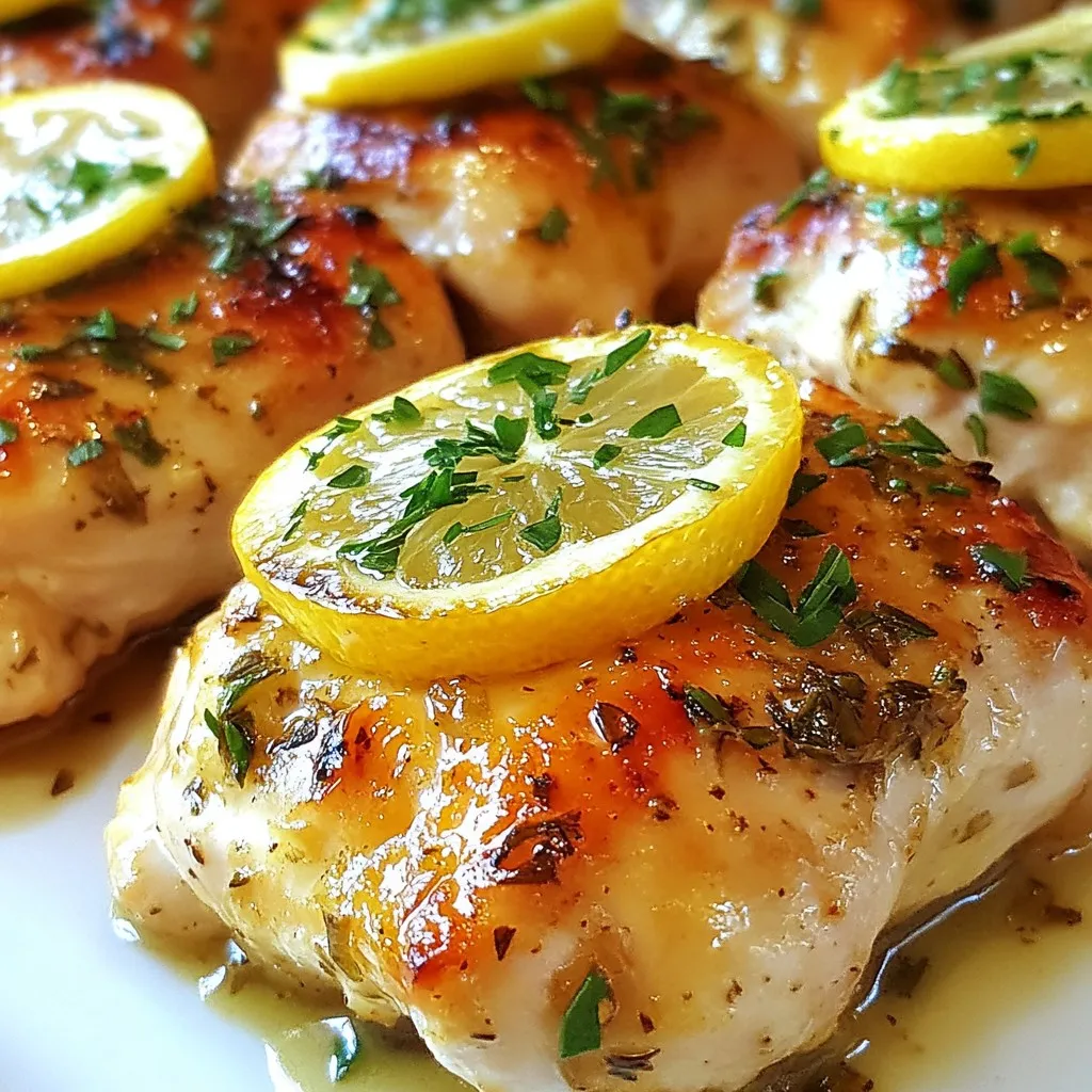 - 4 boneless, skinless chicken breasts - 2 large lemons (one for zest and juice, one sliced) - 4 cloves garlic, minced - 3 tablespoons olive oil - 2 teaspoons fresh thyme (or 1 teaspoon dried thyme) - 2 teaspoons fresh rosemary (or 1 teaspoon dried rosemary) - 1 teaspoon salt - ½ teaspoon black pepper - Fresh parsley, chopped (for garnish) - Additional lemon slices Lemon Baked Chicken starts with simple, fresh ingredients. I love using boneless, skinless chicken breasts because they cook evenly and stay moist. Fresh lemons are key. They add zest, juice, and slices that brighten the dish. The zest gives a strong flavor that makes each bite pop. For the marinade, I use garlic, olive oil, thyme, rosemary, salt, and black pepper. These seasonings blend well. They create a savory taste that pairs perfectly with the lemon. The garlic adds depth while the herbs bring a fresh aroma. When serving, I like to sprinkle fresh parsley on top. It adds a vibrant green color and a hint of freshness. Adding extra lemon slices on the side makes the dish look pretty and inviting. You can pair this chicken with steamed veggies or a light salad for a nice meal. This dish is easy to make, and it always impresses! {{ingredient_image_1}} - First, preheat your oven to 400°F (200°C). This ensures even cooking. - In a small bowl, combine the zest and juice of one lemon, minced garlic, olive oil, thyme, rosemary, salt, and pepper. This mixture makes a tasty marinade. - Next, take the chicken breasts and place them in a baking dish. Pour the marinade over the chicken. Make sure each piece is well coated. - It’s best to let the chicken marinate for at least 15 minutes. You can also refrigerate it for up to 2 hours. This extra time adds flavor. - After marinating, place sliced lemon on top of the chicken. This adds a fresh taste while cooking. - Bake the chicken in the oven for 25-30 minutes. Check for an internal temperature of 165°F (75°C). The juices should run clear when it’s done. To make your chicken burst with flavor, marinate it well. Use a mix of lemon zest, juice, olive oil, garlic, thyme, rosemary, salt, and pepper. Let it sit for at least 15 minutes. For even better taste, marinate it for up to 2 hours in the fridge. You can also add a bit of honey or Dijon mustard to the marinade. This gives a sweet and tangy twist. Check the chicken's internal temperature to avoid dry meat. It should reach 165°F (75°C) for safe eating. Use a meat thermometer to be sure. After you take the chicken out of the oven, let it rest for 5 minutes. This helps the juices stay inside, making each bite juicy. Serve the chicken on a nice platter. Add a sprig of fresh parsley and some lemon slices for a pop of color. This makes a beautiful dish for any table. Pair your lemon baked chicken with steamed veggies or a light salad for a full, elegant meal. Pro Tips Marinate Longer for More Flavor: Allowing the chicken to marinate for at least 2 hours in the refrigerator can significantly enhance the flavor. The longer it sits, the more the herbs and lemon infuse into the meat. Use a Meat Thermometer: To ensure your chicken is perfectly cooked, use a meat thermometer. The internal temperature should reach 165°F (75°C) for safe consumption. Let It Rest: After baking, let the chicken rest for at least 5 minutes before serving. This allows the juices to redistribute, making the chicken more tender and juicy. Presentation Matters: For an elegant presentation, serve the chicken on a platter with lemon slices and a sprinkle of freshly chopped parsley. This adds a pop of color and freshness to the dish. {{image_2}} You can change up the herbs in this recipe. Instead of thyme and rosemary, try oregano or basil for a twist. These herbs add their own unique flavors. If you like heat, add chili flakes to the marinade. This gives your dish a spicy kick that many love. Feel free to use chicken thighs or drumsticks instead of breasts. Bone-in cuts add a rich flavor. Just remember, cooking times will be longer. For thighs, bake for about 35-40 minutes. Always check the internal temperature to ensure it reaches 165°F (75°C). Adding vegetables to the dish makes it even better. You can toss in carrots, bell peppers, or zucchini. These vegetables roast nicely and soak up the lemon flavor. Place them around the chicken in the baking dish. This way, you create a complete meal in one pan. To keep your Lemon Baked Chicken fresh, store it in an airtight container. This helps prevent moisture loss. You can keep it in the fridge for up to three days. If you want to enjoy it later, freezing is a great option. When freezing, wrap the chicken tightly in plastic wrap, then place it in a freezer bag. This protects it from freezer burn. You can freeze it for up to three months. To reheat, thaw it in the fridge overnight. Warm it in the oven at 350°F (175°C) for about 20 minutes. Don’t let any chicken go to waste! You can shred it for salads or tacos. Add it to soups or stir-fries for extra flavor. Try making a lemon chicken pasta with your leftovers for a new meal! To check if your chicken is done, use a meat thermometer. The internal temperature should reach 165°F (75°C). This means the chicken is safe to eat. If you don’t have a thermometer, look for clear juices when you cut into the meat. If the juices run clear, it's cooked. Let the chicken rest for five minutes after baking. This helps keep it juicy and tender. Yes, you can use skin-on chicken. However, cooking times may change. Skin-on chicken takes longer to bake. Aim for 30-35 minutes at 400°F. Skin-on chicken can add extra flavor and moisture. Just make sure to check the internal temperature. It should still reach 165°F (75°C) for safety. Lemon Baked Chicken pairs great with many sides. Here are some tasty options: - Steamed vegetables: Broccoli, green beans, or asparagus. - Light salads: A simple mixed greens salad with a lemon vinaigrette. - Rice or quinoa: These grains absorb the chic