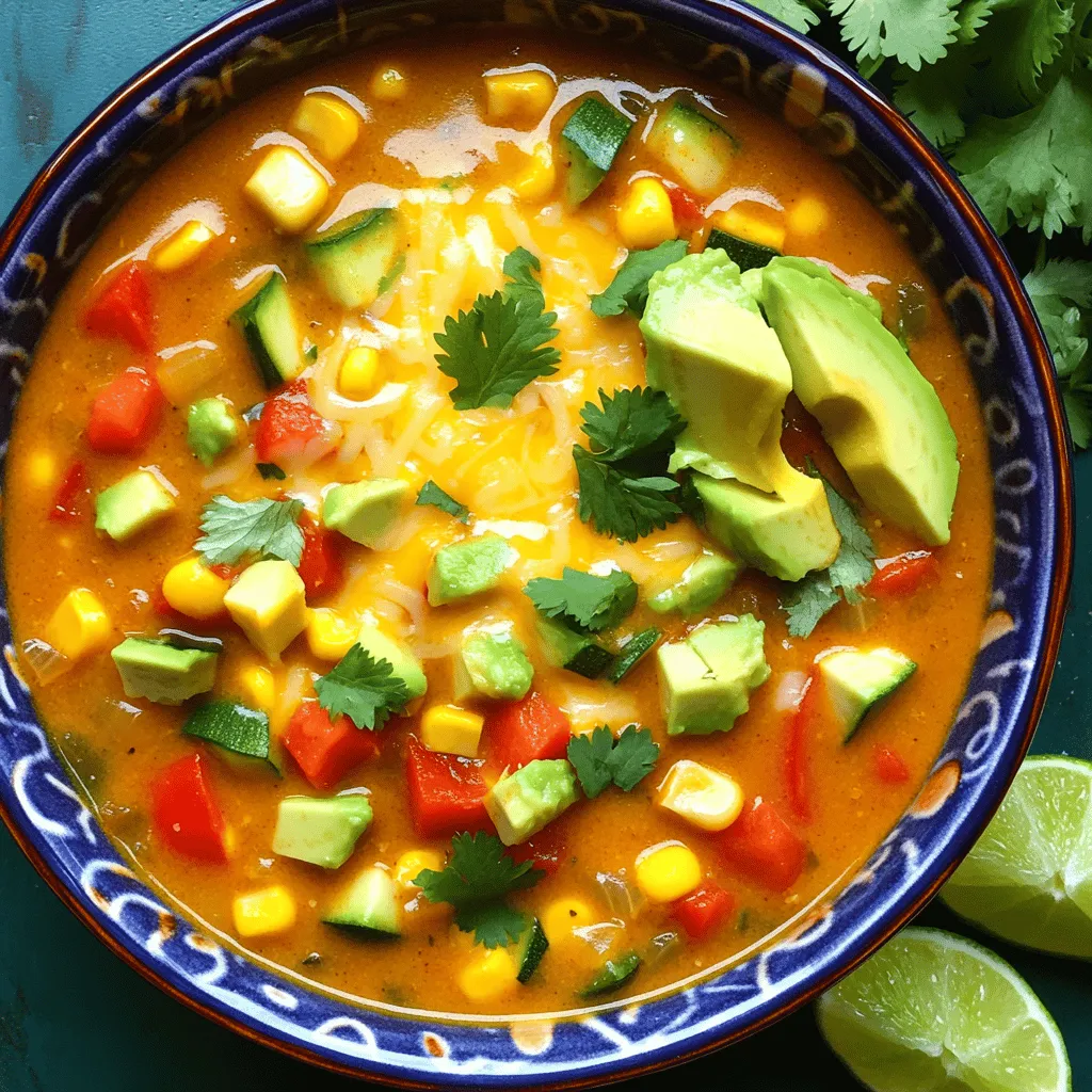Let’s break down the ingredients. First, you need olive oil. This helps to sauté the veggies. Next, gather your vegetables: onion, garlic, bell peppers, zucchini, and corn. These give the soup a fresh taste.