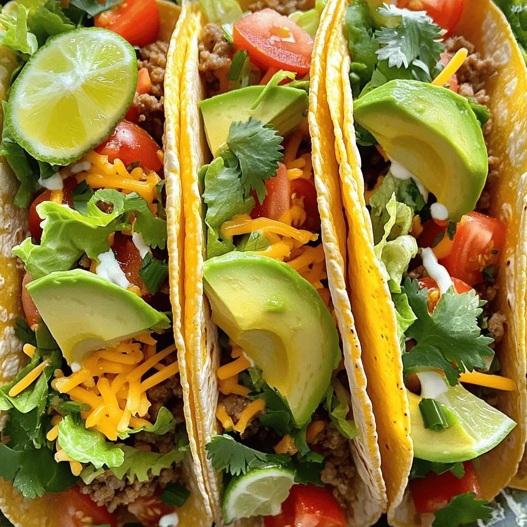 Now, it’s time to build your tacos. Start by laying out each warm tortilla. Spoon a generous amount of the cooked meat onto each tortilla. Top the meat with chopped romaine lettuce, diced tomatoes, shredded cheddar cheese, and fresh cilantro. For a creamy touch, add a few slices of avocado on top. Serve your tacos with lime wedges on the side for squeezing. This adds great flavor. For a detailed recipe, check the Full Recipe.