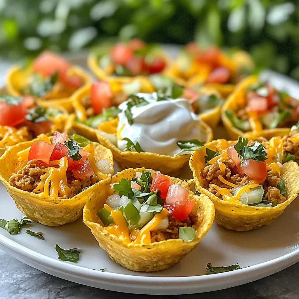- 1 pound ground chicken - 12 small corn tortillas - 1 cup shredded cheddar cheese - 1 cup shredded lettuce - 1 cup diced tomatoes - ½ cup sour cream The main ingredients for mini baked chicken tacos are simple yet flavorful. The ground chicken serves as the base, and I love its versatility. You can season it to your taste. Corn tortillas are perfect for these mini tacos. They hold the filling well and add a nice crunch. The cheese melts beautifully, adding richness. Fresh lettuce and diced tomatoes provide a crisp contrast to the hearty filling. - 1 tablespoon olive oil - 1 small onion, finely chopped - 2 cloves garlic, minced - 1 teaspoon ground cumin - 1 teaspoon chili powder - Salt and pepper to taste For seasoning, I use olive oil to sauté the onion and garlic. This step builds a strong flavor in the chicken. Ground cumin and chili powder give the filling its warmth. I add salt and pepper to balance the taste. These spices make the chicken delicious and fragrant. You can adjust them based on your own preferences. - Fresh cilantro for garnish I like to finish the tacos with fresh cilantro. It adds a burst of color and flavor. You can also use sour cream for creaminess. Adding some extra vegetables, like avocado or bell peppers, can make them even better. These garnishes enhance the look and taste of your mini tacos. Enjoying them fresh adds to the fun! {{ingredient_image_1}} 1. Sautéing onions and garlic Start by heating olive oil in a large skillet over medium heat. Add finely chopped onion and minced garlic. Sauté until the onion turns translucent, about 3-4 minutes. This step builds a flavorful base for your chicken. 2. Cooking ground chicken with spices Next, add one pound of ground chicken to the skillet. Use a spatula to break it apart. Cook until the chicken is browned and no longer pink, which takes about 5-7 minutes. Stir in one teaspoon of ground cumin, one teaspoon of chili powder, salt, and pepper to taste. Mix well to blend the spices into the chicken evenly. Remove from heat and let it cool slightly. 1. Softening tortillas While the chicken cools, wrap twelve small corn tortillas in a damp paper towel. Microwave them for about 30 seconds. This softens the tortillas, making them easier to shape. 2. Forming tortilla cups Lightly grease a muffin tin to prevent sticking. Take one softened tortilla and place it in a muffin cup. Gently press it down to form a taco shell shape. Repeat this for the remaining tortillas. 1. Filling tortilla cups Spoon the chicken mixture into each tortilla cup. Fill them generously, making sure each cup has enough chicken. Next, sprinkle shredded cheddar cheese on top of the chicken in each cup. 2. Baking until crispy and golden Preheat your oven to 375°F (190°C). Place the muffin tin in the oven and bake for about 15-20 minutes. Keep an eye on them until the tortillas are crispy and the cheese is melted and bubbly. Once done, remove them from the oven and let them cool for a few minutes. Carefully lift the taco cups out from the muffin tin. To enhance the flavor, always season the chicken while cooking. Use ground cumin and chili powder for a tasty kick. Fresh herbs like cilantro can add a burst of freshness at the end. To avoid dryness, do not overcook the chicken. Cook it just until it turns brown and is no longer pink. This keeps the filling juicy and tender. Forming taco cups can be tricky, but it’s easy once you know how. Use a greased muffin tin to hold the tortillas in shape. Don't forget to warm the tortillas in a damp paper towel. This makes them soft and easy to mold. To ensure crispy tortillas, bake them at 375°F for 15-20 minutes. Check to see they are golden and crunchy. For the best side dishes, think fresh and colorful. Serve with a simple salad or some guacamole for a nice contrast. You can get creative with serving. Try adding a spicy salsa or a zesty lime wedge to each plate. This adds fun and flavor for your guests. Pro Tips Use Fresh Ingredients: Fresh vegetables and herbs enhance the flavor of your tacos significantly. Opt for ripe tomatoes and fresh cilantro for the best taste. Customize the Spices: Feel free to adjust the spice levels by adding more chili powder or even a few jalapeños for a kick. Tailor it to your heat preference! Make Ahead: You can prepare the chicken mixture in advance and store it in the fridge. Just assemble and bake the taco cups when you're ready to serve. Experiment with Fillings: Experiment with different proteins like beef or turkey, or make it vegetarian by using black beans or lentils for a delicious twist. {{image_2}} You can easily swap the ground chicken for other proteins. Ground turkey works great and has a similar taste. If you want beef, try using lean ground beef. Both options give your tacos a different flair. For a vegetarian twist, consider using black beans or lentils. These options are hearty and full of flavor. You can also add chopped veggies like bell peppers or zucchini. They add crunch and nutrition. Changing the spices can give your tacos a fresh taste. For a zestier option, use taco seasoning instead of cumin and chili powder. You can also try smoked paprika for a smoky flavor. Experiment with different spice blends to find what you love. Toppings can change everything! Instead of just cheese, add sliced jalapeños for heat. Avocado or guacamole adds creaminess. You can also mix in corn or black olives for extra texture. If you need gluten-free options, use corn tortillas. They are naturally gluten-free and perfect for this recipe. Check labels to ensure your tortillas meet gluten-free standards. For a low-carb alternative, use lettuce wraps instead of tortillas. This swap cuts carbs while still giving you that taco feel. You can also use cauliflower tortillas, which are tasty and healthy. To keep your mini baked chicken tacos fresh, store them properly. You can keep them in the fridge or freezer. - Refrigerator Tips: Place tacos in an airtight container. They las