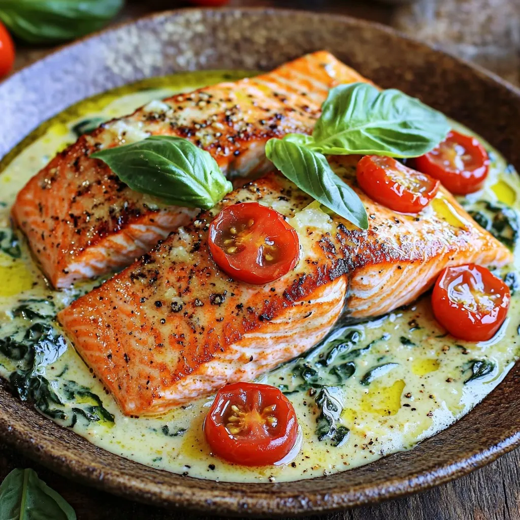 Carefully transfer the salmon to a serving dish. Drizzle the remaining creamy sauce over the top for extra goodness. Garnish with fresh basil leaves for a pop of color. For an amazing presentation, serve it over a bed of cooked pasta or quinoa. Add some halved cherry tomatoes around the plate for a beautiful touch. Enjoy!