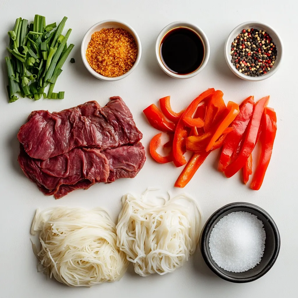 Gathering the right ingredients is key to making Mongolian Beef Noodles. Start with the rice noodles, which give the dish its base. They cook fast and soak up all the flavors.