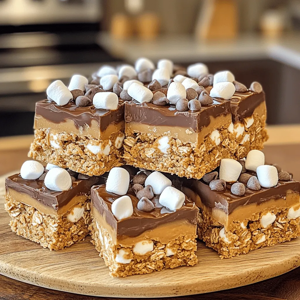 - 1 cup graham cracker crumbs - 1 cup rolled oats - 1/2 cup creamy peanut butter - 1/2 cup honey or maple syrup - 1/2 cup mini chocolate chips - 1/2 cup mini marshmallows - 1/4 cup unsweetened cocoa powder - 1/4 teaspoon salt - 1 teaspoon vanilla extract The ingredients for No Bake S'mores Peanut Butter Bars are simple yet packed with flavor. The graham cracker crumbs give a classic s'mores taste. Rolled oats add a chewy texture. Creamy peanut butter binds everything together for a rich flavor. Honey or maple syrup adds sweetness and helps set the bars. Mini chocolate chips and mini marshmallows bring that delightful s'mores twist. Cocoa powder adds a hint of chocolate, while salt and vanilla enhance all the flavors. - Alternative nut butters: You can swap creamy peanut butter for almond or cashew butter. This change gives a new twist to the flavor. - Vegan options for honey: Use maple syrup or agave nectar instead of honey. Both options keep it sweet and vegan-friendly. - Using different chocolate types: You can use dark chocolate chips or white chocolate chips. Each choice adds a different flavor to the bars. These substitutions let you customize the recipe. Whether you have allergies or want to try new flavors, these swaps work well! - Mixing the dry ingredients Start with a large bowl. Add 1 cup of graham cracker crumbs, 1 cup of rolled oats, 1/4 cup of unsweetened cocoa powder, and 1/4 teaspoon of salt. Mix these dry items well. This step is key for even flavor. - Combining the wet ingredients In another bowl, add 1/2 cup of creamy peanut butter, 1/2 cup of honey or maple syrup, and 1 teaspoon of vanilla extract. Stir until the mixture is smooth and well mixed. This creamy mixture will bind everything together. - How to fold in mix-ins Pour the peanut butter mixture into the dry mix. Stir until everything combines. Then, gently fold in 1/2 cup of mini chocolate chips and 1/2 cup of mini marshmallows. Make sure they are evenly spread throughout the mix. - Pressing the mixture into the pan Line an 8x8 inch baking pan with parchment paper. Leave some paper hanging over the edges for easy removal. Press the mixture firmly into the pan. Use your hands or a spatula to smooth the top. This ensures the bars hold their shape. - Refrigeration time and tips Place the pan in the fridge for at least 2 hours. This chilling time helps the bars set properly. You want them firm enough to cut easily. - Removing and cutting the bars Once set, lift the bars out of the pan using the parchment paper. Cut into squares or bars as you like. Enjoy your no bake s'mores peanut butter bars! To ensure your bars hold together, pack the mixture tightly in the pan. Use a spatula or your hands to press it down firmly. This helps them stay intact when you cut them. The right flavor balance is key too. The sweetness from the honey or maple syrup blends well with the salt and cocoa. Adjust these to your taste for a yummy treat. For a fun presentation, serve these bars on a rustic wooden platter. Drizzle some melted chocolate on top for extra flair. Sprinkle mini marshmallows on the bars to make them look festive. Pair these bars with a cold glass of milk or hot cocoa. They also go great with a cup of coffee for a sweet pick-me-up. Use a large mixing bowl for combining dry ingredients. A sturdy bowl helps keep everything in place. For the wet ingredients, a smaller bowl works best. I recommend using an 8x8 inch baking pan. It’s the perfect size for making these bars. Line it with parchment paper for easy removal. {{image_2}} You can change up the nuts in these bars to add a new taste. Try walnuts or almonds for a nice crunch. You can also swap the chocolate for other flavors. Use white chocolate or butterscotch chips for a sweet twist. This keeps the bars fun and fresh. If you need gluten-free options, use gluten-free graham crackers. This way, everyone can enjoy them. For nut-free alternatives, try sunbutter or soy nut butter. These options work well and taste great. Adding seasonal ingredients can make these bars more special. In fall, mix in some pumpkin spice. For summer, add fresh berries for a fruity flavor. You can also make themed variations for holidays. For Halloween, add orange sprinkles. For Christmas, use red and green mini marshmallows. These small changes make the bars festive and exciting. To keep your No Bake S'mores Peanut Butter Bars fresh, store them in a cool place. Use an airtight container to protect them from moisture. You can also wrap each bar in plastic wrap for extra safety. This method helps keep the bars soft and tasty. These bars can last up to one week in the fridge. If you want to keep them longer, you can freeze them. Wrap each bar in plastic wrap and place them in a freezer bag. They can stay frozen for up to three months. Just remember to label the bags with the date. After freezing, let the bars thaw in the fridge overnight. If they feel hard, you can warm them slightly in the microwave. Heat them for just a few seconds to soften them. Serve these delicious bars chilled or at room temperature. Enjoy the gooey chocolate and marshmallow flavors! Can I make these bars vegan? Yes, you can make these bars vegan. Use maple syrup instead of honey. Choose a vegan chocolate that fits your taste. Replace peanut butter with almond or sunflower seed butter. How do I prevent the bars from sticking to the pan? To prevent sticking, line your pan with parchment paper. Leave some overhang for easy lifting. Press the mixture firmly into the pan. This will help it hold together well. What to do if the mixture is too crumbly? If your mixture is crumbly, add a bit more peanut butter or honey. Mix it in until it becomes sticky. You want it to hold together when pressed. How to fix bars that are too soft? If your bars are too soft, return them to the fridge to chill longer. You can also add a bit more graham cracker crumbs or oats to firm them up. Caloric content per bar Each bar contains about 150 calor