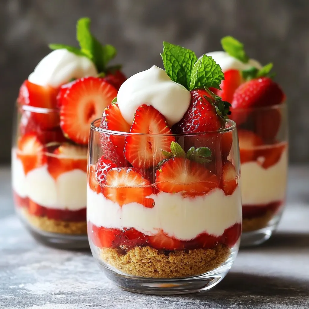 To make perfect No-Bake Strawberry Cheesecake Parfaits, you need a few key ingredients. The graham cracker crumbs and melted butter form a tasty base. You will also need cream cheese, powdered sugar, and vanilla extract for the rich filling. Heavy whipping cream adds a light texture. The fresh strawberries bring sweetness and color to each layer. A bit of sugar helps enhance the fruit’s natural flavor.