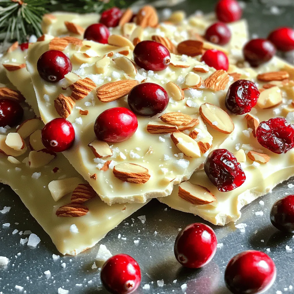 These ingredients bring a mix of sweet and crunchy. The white chocolate adds a creamy base, while cranberries give a tart kick. The almonds add a satisfying crunch.