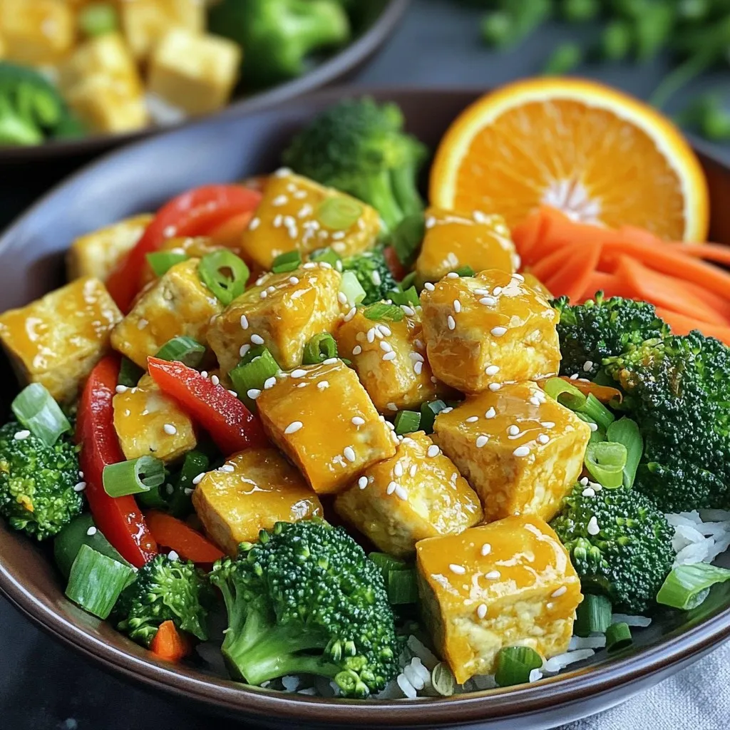 - 14 oz firm tofu - 2 cups broccoli florets - 1 red bell pepper, sliced - 1 carrot, julienned - 4 green onions, chopped - 1 tablespoon sesame seeds - 1/2 cup fresh orange juice - Zest of 1 orange - 2 tablespoons soy sauce - 1 tablespoon maple syrup - 1 tablespoon rice vinegar - 1 teaspoon grated fresh ginger - 1 garlic clove, minced - Pinch of red pepper flakes (optional) The main ingredients set the stage for a tasty meal. Firm tofu is the star, giving a great base. I like to press it first. This makes it less watery and helps it get extra crispy. Fresh broccoli, red bell pepper, and carrot add color and crunch. They also bring a mix of flavors that work well together. Don’t forget the green onions and sesame seeds for garnish. They give a nice finish and a bit of extra flavor. The orange sauce is what makes this dish special. Fresh orange juice and zest bring a bright taste. I use soy sauce for a savory touch. Maple syrup adds a hint of sweetness, while rice vinegar gives it a nice tang. Fresh ginger and garlic boost the flavor even more. If you want some heat, add a pinch of red pepper flakes. This sauce ties all the ingredients together in a way that feels fresh and exciting. To start, I make the orange sauce. I combine all the sauce ingredients in a bowl. This includes fresh orange juice, orange zest, soy sauce, maple syrup, rice vinegar, ginger, garlic, and optional red pepper flakes. I whisk until well mixed. This sauce adds a bright and zesty flavor to our dish. Next, I prepare the tofu. I coat the cubed tofu with cornstarch. This gives the tofu a crispy edge. Then, I heat vegetable oil in a large skillet over medium-high heat. Once the oil is hot, I add the coated tofu. I cook it for about 5 to 7 minutes. I turn the tofu occasionally until it is golden and crispy on all sides. After the tofu is crispy, I remove it from the skillet and place it on a plate. In the same skillet, I add broccoli, red bell pepper, and carrot. I stir-fry these vegetables for about 5 minutes. I cook them until they are crisp-tender. Next, I return the crispy tofu to the skillet with the veggies. I pour the orange sauce over everything. I stir well to coat all the ingredients. Finally, I let it simmer for about 2 to 3 minutes. This helps the sauce heat through and thicken slightly. To make crispy tofu, start with firm tofu. Press it to remove water. This step is key for texture. Wrap the tofu in a clean kitchen towel and place a heavy object on top. Press for at least 15 minutes. After pressing, cut the tofu into even cubes. Coat the tofu in cornstarch before cooking. This coating helps the tofu get golden and crispy. Heat the oil in a skillet until it shimmers. Then, add the tofu and cook until all sides are brown. This process takes about 5-7 minutes. Flip the tofu gently to avoid breaking it. To boost the orange taste, use fresh orange juice and zest. Fresh ingredients make a big difference. When you use fresh, you get a brighter, zesty flavor. If you need to substitute the orange juice, you can use tangerine juice or a mix of lemon and lime juice. But keep in mind, the taste will change slightly. For the orange sauce, mix all the ingredients well. This mix includes soy sauce, maple syrup, rice vinegar, ginger, and garlic. The balance of sweet, sour, and savory gives the dish its unique flavor. If you love spice, add red pepper flakes to the sauce. For a hearty base, serve the orange tofu over rice or quinoa. Both options soak up the sauce well. You can also try brown rice for a nuttier flavor. Get creative with toppings! Chopped green onions add a fresh crunch. A sprinkle of sesame seeds gives a nice finish. For an extra pop of color, add a slice of orange on the side. This not only looks great but also adds more flavor. Serve the bowls in deep plates for a beautiful presentation. Arrange the tofu and veggies neatly. Enjoy your tasty, homemade orange tofu bowls! {{image_2}} You can swap out the broccoli, carrots, and bell peppers for other veggies. Try using snap peas, zucchini, or even mushrooms for a different taste. Seasonal vegetables like asparagus in spring or squash in fall add freshness too. Don’t be afraid to mix and match! Each choice changes the bowl's flavor and texture. If you want to switch up the protein, tempeh or seitan works well. Tempeh adds a nutty flavor, while seitan gives a chewy texture. When using these, adjust the sauce slightly. Tempeh absorbs flavors well, so you might need less soy sauce. Seitan is heartier, so consider adding more orange juice for balance. This recipe is already vegetarian and vegan. Just check all your sauces and ingredients. Use tamari instead of soy sauce for a gluten-free option. Always read labels to ensure no hidden animal products sneak in. Enjoy a tasty, healthy meal without missing out! To keep your Orange Tofu Bowls fresh, place leftovers in the fridge. Store the tofu and veggies separately from the sauce. This helps keep the tofu crispy. Use airtight containers to prevent moisture loss. Glass containers work best, but plastic ones are fine too. When reheating, you want to keep the tofu crispy. The best method is to use a skillet. Heat the skillet on medium-high heat and add a little oil. Once hot, add the tofu pieces and warm them for about 3-4 minutes. If you want to reheat with sauce, do this in a separate pan. Heat the sauce first, then add the tofu to coat it. Stir gently to warm through. Yes, you can freeze this dish! However, it’s best to freeze the tofu and veggies without the sauce. To freeze, place them in a single layer on a baking sheet. Once frozen, transfer them to a freezer-safe bag. When you’re ready to eat, thaw the tofu and veggies in the fridge overnight. Reheat as mentioned above for the best texture. To add heat to your Orange Tofu Bowls, try these tips: - Mix in more red pepper flakes for a kick. - Add sliced fresh chili peppers for a bold flavor. - Use a spicy sauce, like sriracha, in the orange sauce. - For a mil