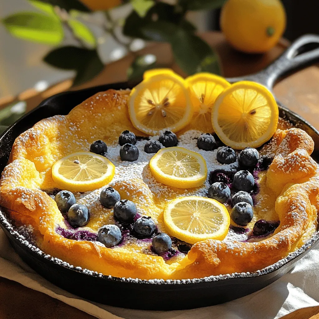 Serving a Dutch baby pancake can be fun and creative! You can dust it with powdered sugar to add sweetness. Fresh lemon slices on top give it a zesty kick. Add berries, like blueberries or strawberries, for color and flavor. You can also serve it with maple syrup or whipped cream. Enjoy your delicious, perfect Lemon Blueberry Dutch Baby with family and friends!