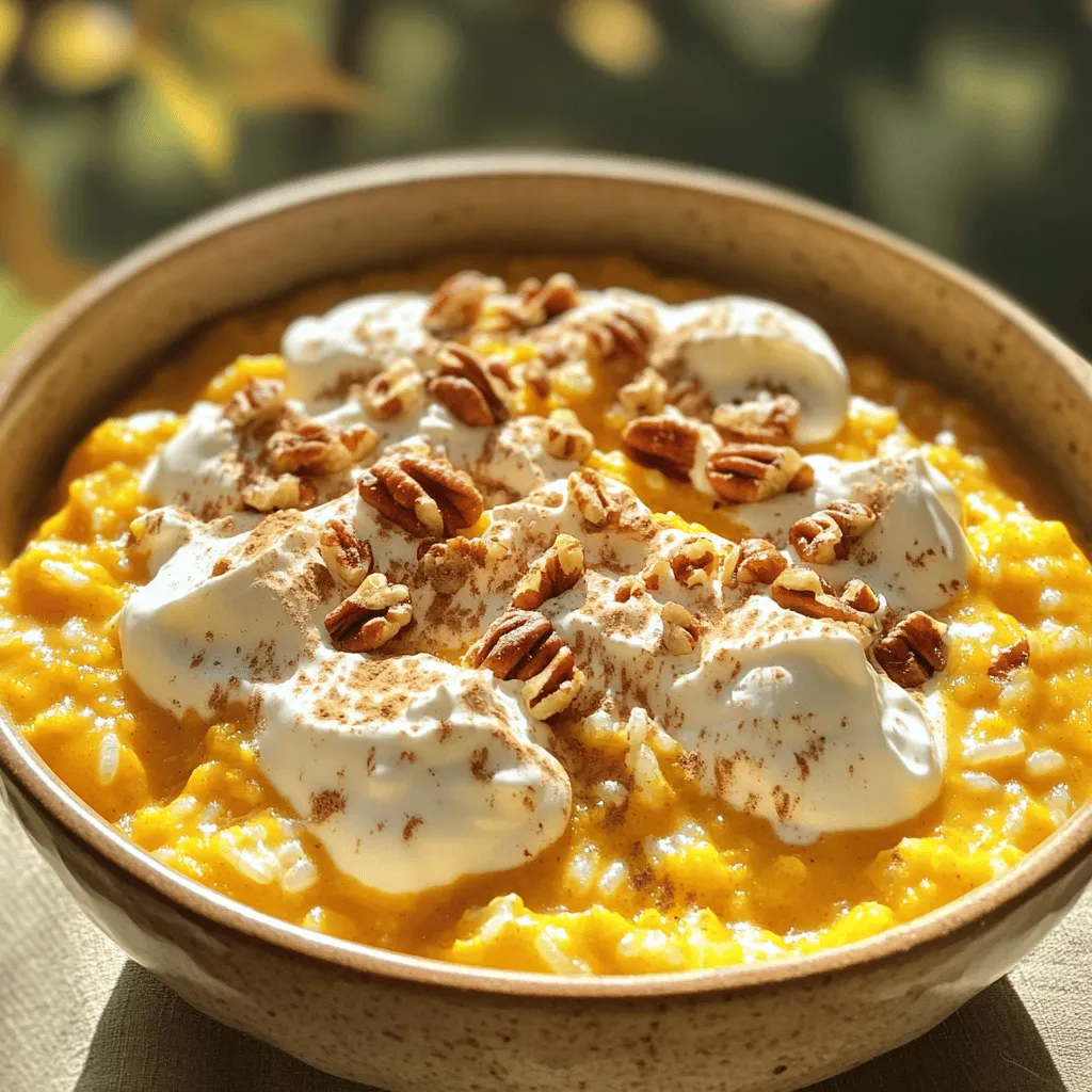 When making Pumpkin Spice Rice Pudding, you need a few simple ingredients. Here’s what you’ll need: - 1 cup Arborio rice - 4 cups whole milk - 1 cup pumpkin puree - 1/3 cup brown sugar - 1 teaspoon pumpkin pie spice - 1 teaspoon vanilla extract - 1/4 teaspoon salt - Optional add-ins: - 1/2 cup raisins - 1/4 cup chopped pecans (for topping) - Whipped cream (for serving) Each ingredient plays a key role in creating rich flavors. Arborio rice gives the pudding its creamy texture. Whole milk adds that wonderful richness. Pumpkin puree is the star, bringing in a lovely fall flavor. Brown sugar sweetens the dish, while pumpkin pie spice adds warmth. Vanilla extract lifts the overall taste, and a pinch of salt balances it. You can also add raisins for sweetness and pecans for crunch. The whipped cream is a nice touch for serving, making it feel special. 1. In a medium saucepan, combine 1 cup of Arborio rice with 4 cups of whole milk. This rice gives our pudding a creamy texture. 2. Next, incorporate 1 cup of pumpkin puree. This adds flavor and color to the dish. 3. Now, add 1/3 cup of brown sugar. This sugar will give the pudding its sweet taste. If you want it sweeter, you can add a bit more. 4. Then, mix in 1 teaspoon of pumpkin pie spice. This will bring that warm, fall flavor. Finally, add 1/4 teaspoon of salt to enhance all the flavors. 1. Bring the mixture to a gentle boil over medium heat. Make sure to stir it often. This helps prevent sticking and burning. 2. Once it starts boiling, reduce the heat to low. Let it simmer uncovered. Stir occasionally for about 25-30 minutes. This is when the rice will become tender and the pudding thickens. 3. Keep an eye on the time. If the rice is still hard, you can cook it a bit longer. Just make sure to stir so it doesn’t stick. 1. After cooking, stir in 1 teaspoon of vanilla extract. If you like, you can also add 1/2 cup of raisins at this point. Cook for an additional 5 minutes. 2. Remove from heat and let it cool slightly. The pudding will thicken a bit more as it cools. 3. For serving, spoon the pudding into bowls. Sprinkle chopped pecans on top for a nice crunch. You can serve it warm or chilled. If you want, add a dollop of whipped cream for extra creaminess. - To avoid sticking, stir often while cooking. Use a wooden spoon for best results. - If your pudding is too thin, let it simmer a bit longer. Keep stirring to prevent burning. - Use a heavy-bottomed pot. It distributes heat evenly and helps your pudding cook well. - You can substitute pumpkin pie spice with cinnamon or nutmeg. This adds depth to your dish. - Try adding a pinch of nutmeg. It pairs nicely with pumpkin and adds warmth. - If you like, mix in maple syrup instead of brown sugar. It gives a nice twist to the flavor. - For garnish, top with chopped pecans or a sprinkle of cinnamon. This adds crunch and color. - Serve with fresh cranberries for a tangy contrast. They brighten the dish and add seasonal flair. - A dollop of whipped cream makes it rich and smooth. It’s a great finishing touch for your pudding. {{image_2}} You can play with rice types in this recipe. Arborio rice is creamy, but other options work too. Jasmine rice gives a nice aroma. Sushi rice adds a chewy texture. Both choices keep it fun and new. For a dairy-free twist, try almond or coconut milk. Almond milk offers a light nutty flavor. Coconut milk gives a tropical taste. Both alternatives still create a nice creamy pudding. Add spices to change the flavor in exciting ways. Nutmeg and allspice can blend well with pumpkin pie spice. A hint of ginger can also add warmth. If you love chocolate, stir in some cocoa powder. You can even add chocolate chips for sweetness. Caramel drizzled on top brings a rich touch. These additions make the pudding unique every time. You can serve this rice pudding in fun ways. Layer it with whipped cream and fruit for a parfait look. This adds texture and makes it more appealing. Want a baked version? Pour the pudding into a baking dish. Top with a sprinkle of nuts or crumbs. Bake until golden for a delicious twist. You can enjoy it warm or cold, whatever you like best. To keep your pumpkin spice rice pudding fresh, let it cool first. Store it in an airtight container. This will help prevent it from drying out. For best results, use glass containers. They keep flavors intact and are easy to clean. You can reheat your rice pudding in two ways: the microwave or stovetop. For the microwave, place the pudding in a bowl. Heat it in short bursts, stirring in between. This keeps the pudding creamy. For the stovetop, place the pudding in a saucepan over low heat. Stir often to avoid burning. Add a splash of milk if it seems too thick. To freeze rice pudding, let it cool completely. Then, scoop it into freezer-safe containers. Leave some space at the top for expansion. When you want to enjoy it, thaw the pudding in the fridge overnight. Reheat it using the stovetop method, adding a bit of milk for creaminess. For pumpkin spice rice pudding, I love using Arborio rice. This rice has a high starch content. As it cooks, it releases creamy starch, which makes the pudding rich and smooth. Other types, like long-grain rice, won’t give the same texture. They do not have enough starch to create that creamy feel. Arborio rice is the star here! Yes, you can make this recipe ahead of time. After cooking, let the pudding cool to room temperature. Then, store it in an airtight container in the fridge. It will stay fresh for about three days. When you want to enjoy it, reheat gently on the stove or in the microwave. Add a splash of milk to bring back its creamy texture. To boost the flavor, you can add extra spices. A pinch of nutmeg or cinnamon works wonders. You can also mix in some maple syrup for sweetness. If you want more texture, try adding chopped nuts or dried fruit. You can even swirl in some caramel sauce for a sweet twist. Each change makes the dish more personal and special! We covered 