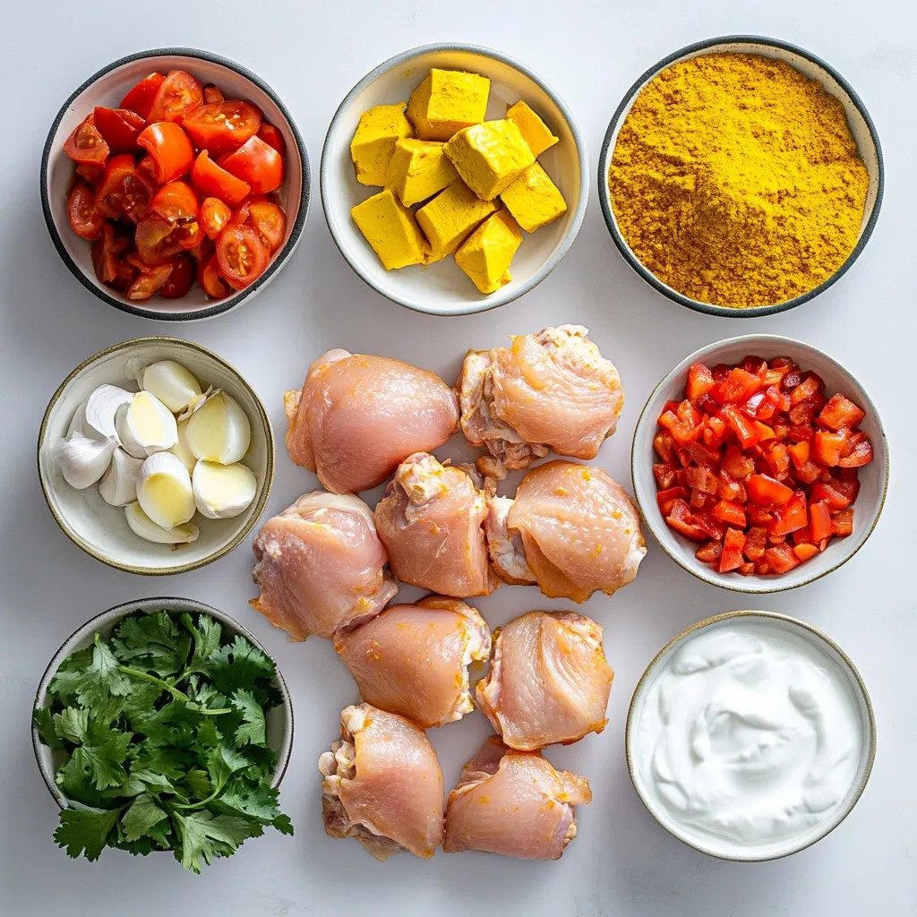 These are the key ingredients you need to make butter chicken. The boneless chicken thighs make the dish tender. The yogurt helps to marinate the chicken, adding flavor and moisture.