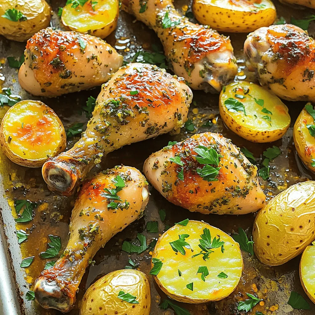 Next, grab a large sheet pan. Arrange the marinated chicken drumsticks and seasoned potatoes in a single layer. Make sure they have space between them for even cooking. Place the sheet pan in your preheated oven.