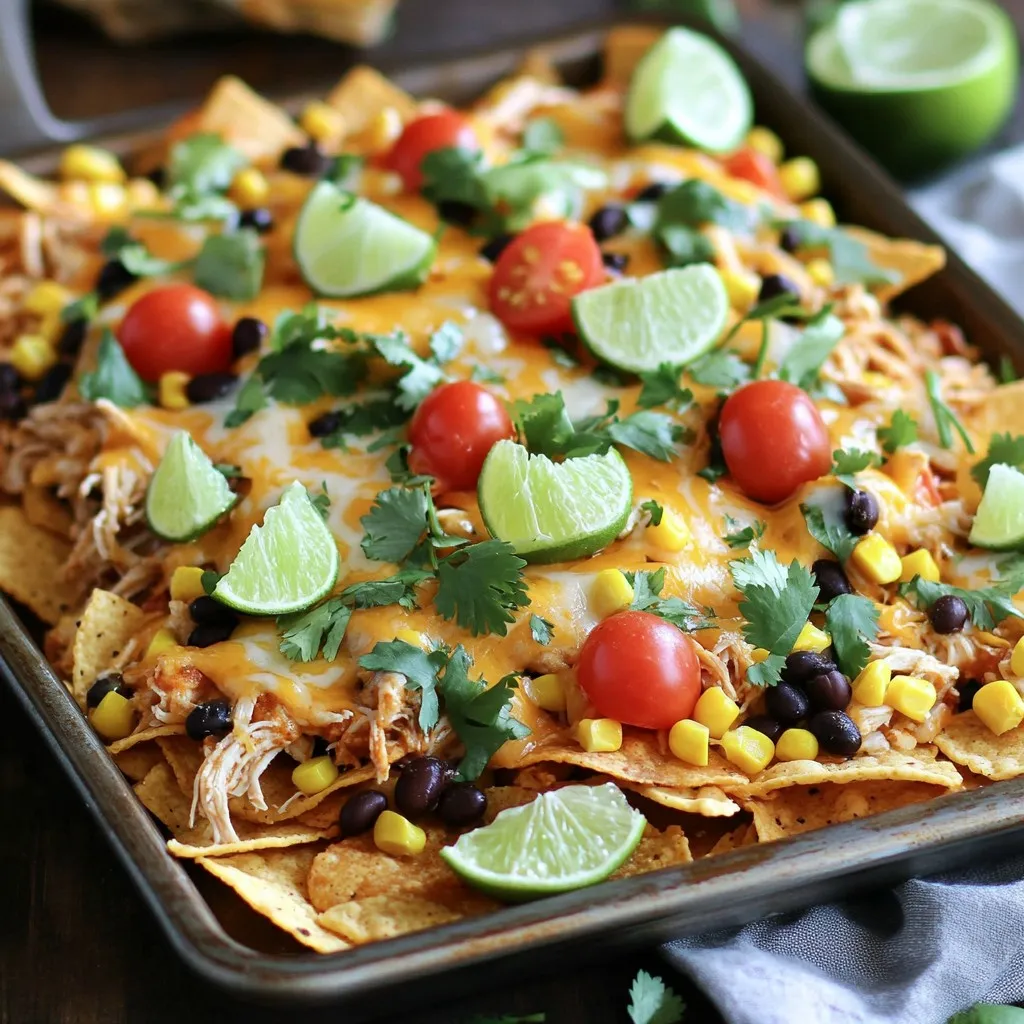 First, I set my oven to 400°F (200°C). This ensures the nachos bake evenly. Next, I gather all my ingredients. I use 2 cups of cooked shredded chicken, which can be rotisserie chicken for ease. I also grab a can of black beans, corn kernels, and cherry tomatoes. These ingredients add flavor and texture. I mince 2 tablespoons of chipotle in adobo sauce and squeeze 1 tablespoon of lime juice. I add a teaspoon of cumin and garlic powder, along with salt and pepper to taste. This mix brings a great kick to the dish.