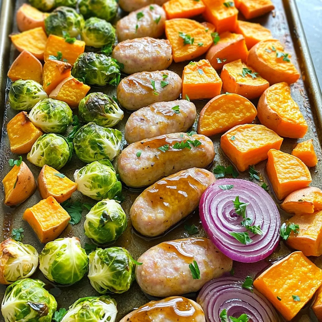 Gather these ingredients for a tasty dish. The chicken or turkey sausage offers lean protein. Brussels sprouts add a great crunch, while sweet potatoes bring sweetness. Carrots and red onions add color and flavor. The maple syrup gives a warm glaze. Olive oil helps everything roast well. Thyme and garlic powder give depth. Don’t forget salt and pepper to bring out all the tastes. Finally, fresh parsley adds a lovely finish. This mix of ingredients makes for a satisfying meal.