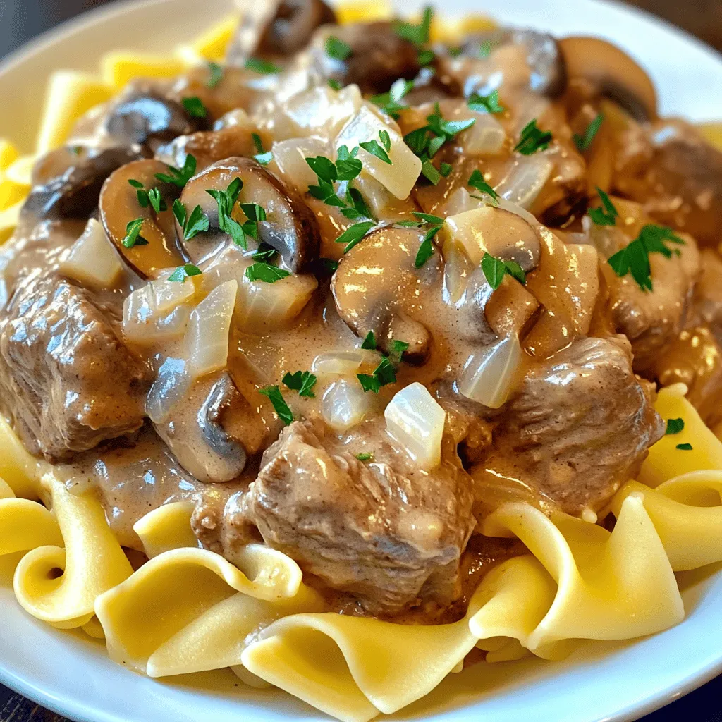 To create a tasty slow cooker beef stroganoff, you need some key ingredients. Here’s what you'll need: - 2 pounds beef stew meat, cut into 1-inch pieces - 1 medium onion, diced - 3 cloves garlic, minced - 8 ounces mushrooms, sliced (cremini or button) - 2 cups beef broth - 1 cup sour cream - 4 tablespoons all-purpose flour - 3 tablespoons olive oil These ingredients form the base of your dish. The beef gives rich flavor, while the onions and garlic add depth. Mushrooms bring a nice texture and earthy taste. Seasonings are what make this dish sing. Here are the spices you will use: - 1 tablespoon Worcestershire sauce - 1 teaspoon dried thyme - 1 teaspoon paprika - Salt and black pepper to taste Worcestershire sauce adds a punch of umami. Thyme and paprika give warmth and complexity. Don’t forget to adjust the salt and pepper to your liking. You can make your beef stroganoff even better with some optional ingredients. Consider these add-ons: - Fresh parsley for garnish - Cooked egg noodles (for serving) Garnishing with fresh parsley brightens the dish. Serving it over egg noodles adds a comforting touch that soaks up all that savory sauce. Start by heating 2 tablespoons of olive oil in a large skillet over medium-high heat. Add the beef stew meat in small batches. Brown each piece on all sides. This step adds great flavor. Once browned, transfer the beef to your slow cooker. Make sure to scrape the skillet to get all the tasty bits. In the same skillet, add 1 tablespoon of olive oil. Sauté the diced onion and minced garlic for 2 to 3 minutes. You want them to soften and become fragrant. Then, add the sliced mushrooms. Cook for another 4 to 5 minutes until they release moisture and shrink down. This process brings out their rich flavor. Now, add the sautéed onion, garlic, and mushrooms to the slow cooker with the beef. Pour in 2 cups of beef broth. Add 1 tablespoon of Worcestershire sauce, 1 teaspoon of dried thyme, and 1 teaspoon of paprika. Season with salt and black pepper to taste. Stir gently to mix everything well. Cover the slow cooker. Cook on low for 6 to 8 hours or on high for 3 to 4 hours until the beef is tender. About 30 minutes before you plan to serve, take a small bowl. Combine 1 cup of sour cream and 4 tablespoons of all-purpose flour. Stir until the mixture is smooth. Gradually add this to the slow cooker, making sure there are no lumps. Slightly increase the heat to high, cover, and cook for another 30 minutes. This will make the sauce thick and creamy. Once thickened, taste the stroganoff and adjust the seasoning if needed. Serve the beef stroganoff over cooked egg noodles. For a fresh touch, garnish with chopped fresh parsley. This adds color and a nice flavor boost. Choosing the right beef is key for great stroganoff. I recommend using beef stew meat. This cut has a good amount of fat. The fat makes the beef tender as it cooks. Look for meat that has a deep red color. Avoid any meat with a lot of gristle. If you can, ask your butcher for advice. They can help you pick the best cut. To get the best flavor, start by browning the beef. This adds a nice crust and rich taste. Use a large skillet and heat olive oil over medium-high heat. Brown the beef in batches to avoid crowding. After browning, don’t skip sautéing the onions and garlic. This step builds layers of flavor. For the slow cooker, keep it simple. Just combine all the ingredients and let it work its magic. If you want a thicker sauce, add more flour to the sour cream mix. Start with the suggested amount, then adjust to your taste. If you prefer a thinner sauce, add a little extra beef broth. Stir well to combine. Always taste the sauce before serving. This way, you can ensure the flavor hits just right. {{image_2}} To make this dish gluten-free, swap out the flour and noodles. You can use cornstarch or arrowroot powder as thickening agents. For noodles, consider using gluten-free pasta or even zucchini noodles. These options keep the flavor rich while ensuring everyone can enjoy this meal. If you want to try different mushrooms, consider using shiitake or portobello. Shiitake mushrooms add a deep, earthy taste, while portobello mushrooms give a meaty texture. Both can change the dish's flavor and make it even more enjoyable. Adding more veggies can enhance this dish. Carrots bring sweetness and a nice crunch. Peas add a pop of color and a fresh taste. You can also use bell peppers or green beans. Simply chop them and add them to the slow cooker at the same time as the beef for a well-rounded meal. To store your leftover beef stroganoff, first let it cool. Use an airtight container. Place it in the fridge. It will last for about three to four days. Make sure the lid is on tight. This keeps the flavors fresh. You can also divide it into smaller portions. This way, you can enjoy it later without waste. If you want to freeze beef stroganoff, follow these steps. First, let it cool completely. Next, use freezer-safe containers. You can also use heavy-duty freezer bags. Remove as much air as possible to prevent freezer burn. It can last for up to three months. When you’re ready to enjoy it, move it to the fridge overnight to thaw. To reheat beef stroganoff, you have a few options. The microwave is quick but may change the texture. Use a medium heat and stir often. If you prefer, use the stove. Pour it into a pan over low heat. Stir it gently until warmed through. You can add a splash of beef broth or water if it feels too thick. For a creamy finish, add a little sour cream while reheating. Yes, you can skip browning the meat. However, this step adds flavor. By browning, you create a nice crust and deep flavor. It makes the dish richer. If you don't brown, the taste may be less intense, but it will still be good. To make it creamy without sour cream, use cream cheese or Greek yogurt. Cream cheese gives a rich and smooth texture. Just mix it in before serving. Greek yogurt can add tanginess and creaminess. Sti