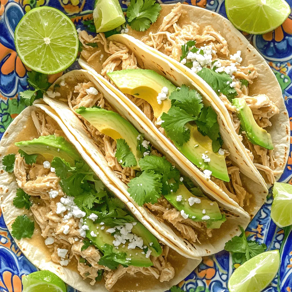 After cooking, use two forks to shred the chicken right in the slow cooker. Stir the chicken with the sauce for full flavor. Next, warm the corn tortillas in a dry skillet or microwave until soft. To assemble, spoon the coconut lime chicken onto each tortilla. Top with sliced avocado, chopped cilantro, and optional crumbled cheese for extra taste. Enjoy your tacos!