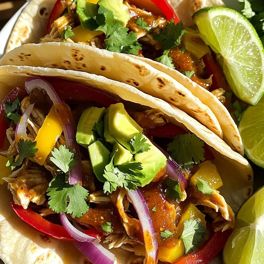 Once the chicken is cooked, take it out of the slow cooker. Use two forks to shred it into bite-sized pieces. Return the shredded chicken to the slow cooker. Stir it well to mix with the sauce and vegetables. To serve, take warm corn or flour tortillas. Fill them with the shredded chicken mixture. Top with fresh cilantro and avocado slices if you like. Squeeze fresh lime juice on top for added flavor. Enjoy your delightful tacos!