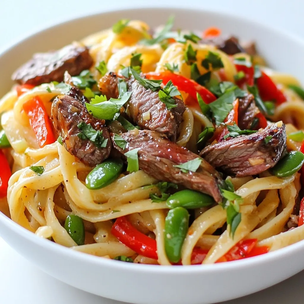 - 8 oz fettuccine pasta - 1 lb flank steak, sliced into thin strips - 2 tablespoons soy sauce - 2 tablespoons honey - 1 tablespoon sriracha (adjust for spice preference) - 1 teaspoon garlic powder - 1 teaspoon ground ginger For this dish, the main ingredients play a vital role. The fettuccine pasta serves as the base, giving you a hearty and comforting texture. Flank steak is perfect here because it cooks quickly and absorbs flavors well. The sauce components, like soy sauce, honey, and sriracha, create a sweet and spicy kick. Garlic powder and ground ginger add depth to the flavor. - 1 red bell pepper, sliced - 1 cup snap peas - 3 green onions, chopped The vegetables bring color and crunch. Red bell pepper adds sweetness, while snap peas give a nice snap. Green onions brighten the dish when you sprinkle them on top. Each vegetable adds a unique texture and flavor, making your pasta dish more vibrant. - 2 tablespoons olive oil - Salt and pepper to taste - Fresh cilantro for garnish Olive oil is key for cooking the steak and vegetables. It helps achieve that beautiful sear on the flank steak. You’ll want to season with salt and pepper to enhance all the flavors. Fresh cilantro not only looks nice but also adds a fresh burst of flavor at the end. {{ingredient_image_1}} First, you need to cook the fettuccine pasta. Follow the package instructions for the best results. This usually takes about 8 to 10 minutes. Make sure to test the pasta for doneness. It should be al dente. Once cooked, drain it and set it aside. Don’t forget to reserve about a cup of the pasta water. This water helps make the sauce smooth. Next, let’s marinate the steak. In a bowl, combine the sliced flank steak with soy sauce, honey, and spices. You’ll want to add sriracha for a kick, garlic powder, and ground ginger for depth. Mix everything well and let it marinate for at least 15 minutes. This step adds tons of flavor to your steak. Now it’s time to cook the steak. Heat olive oil in a large skillet over medium-high heat. Add the marinated steak to the hot skillet. Sauté it for about 5 to 7 minutes until it’s browned. Ensure it reaches your desired doneness. After the steak is ready, remove it from the skillet and set it aside. In the same skillet, add the sliced red bell pepper and snap peas. Sauté them for about 3 to 4 minutes until they are tender yet still crisp. Finally, let’s bring everything together. Add the cooked fettuccine to the skillet with the sautéed vegetables. Pour in the reserved pasta water gradually. This helps adjust the sauce's thickness. Then, return the cooked steak to the skillet. Toss all the ingredients until they mix well. Season with salt and pepper to taste. For a fresh touch, garnish your dish with chopped green onions and fresh cilantro before serving. Enjoy your sweet and spicy steak pasta! To get the best flavor from flank steak, marinate it well. Use a mix of soy sauce, honey, and spices. Let it sit for at least 15 minutes. This lets the steak soak up the flavors. You can also try other marinades. A mix of balsamic vinegar and olive oil works great too. For a twist, add some lime juice and cumin. For perfectly cooked steak, heat your skillet before adding the meat. Cook it for 5-7 minutes until it’s brown. Keep an eye on it to avoid overcooking. When you cook vegetables, aim to keep them crisp. Sauté the red bell pepper and snap peas for 3-4 minutes. This keeps their bright colors and crunch. Serve your Sweet and Spicy Steak Pasta in a shallow pasta bowl. This gives it a nice look. For garnish, sprinkle fresh cilantro and chopped green onions on top. This adds color and flavor. You can also add a slice of lime for a fresh touch. Pro Tips Marinate for Maximum Flavor: Allow the steak to marinate longer than 15 minutes, if possible. This enhances the flavor and tenderness, making every bite delicious. Adjust the Spice Level: Customize the amount of sriracha based on your heat preference. Start with less and add more gradually to find your perfect balance. Vegetable Variations: Feel free to mix in other vegetables like broccoli or carrots for added nutrition and color. Just make sure to adjust the cooking time accordingly. Save Some Pasta Water: The reserved pasta water is your secret weapon for creating a silky sauce. Add it gradually until you reach your desired consistency. {{image_2}} You can easily adjust the sriracha for your spice level. If you like it hot, add more. For a milder dish, use less. You might also try chili flakes instead. They pack some heat and give a nice crunch. Not a fan of fettuccine? You can switch to spaghetti or whole wheat noodles. Both work well and taste great. You can also change the protein. Chicken, shrimp, or even tofu can be tasty substitutes. Each brings its own flavor to the dish. Seasonal veggies can add freshness. In spring, try peas or asparagus. In summer, zucchini or bell peppers work well. Adding fresh herbs can brighten the dish. Basil or parsley can give a lovely touch. They add color and new flavors that pop. To keep your Sweet and Spicy Steak Pasta fresh, store leftovers in the fridge. Use airtight containers to prevent moisture loss. Make sure to cool the pasta before sealing the container. This helps avoid soggy noodles. Try to eat the leftovers within three days for best taste. When reheating, focus on keeping the steak juicy. You can use a microwave or stovetop. For the microwave, heat in short bursts. Stir between intervals to ensure even heat. If you use the stovetop, add a splash of water. Heat gently over low heat to avoid overcooking the steak. For long-term storage, you can freeze the pasta. First, let it cool completely. Place it in freezer-safe bags or containers. Be sure to remove as much air as possible. When you want to eat it, thaw it in the fridge overnight. For best texture, avoid microwaving it from frozen. Instead, reheat it on the stovetop with a bit of water. You can serve a fresh salad on the side. A