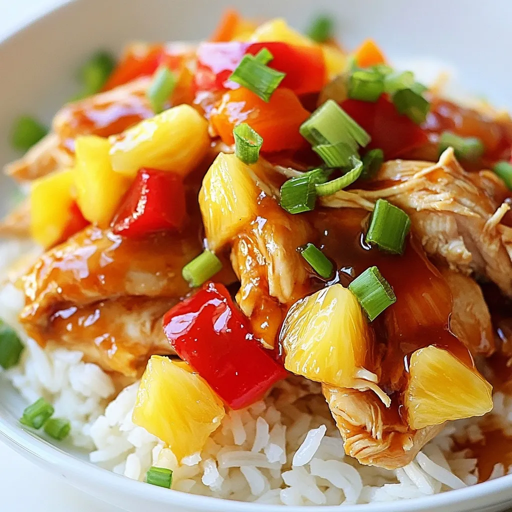 To make Sweet Hawaiian Crockpot Chicken, gather these simple ingredients: - 2 lbs boneless, skinless chicken thighs - 1 cup pineapple chunks (fresh or canned) - 1 cup diced bell peppers (red and orange for color) - 1/2 cup red onion, diced - 1/4 cup low-sodium soy sauce - 1/4 cup honey - 2 tablespoons apple cider vinegar - 1 tablespoon garlic, minced - 1 teaspoon ginger, minced - Salt and pepper to taste - 2 green onions, sliced (for garnish) - Cooked jasmine rice (for serving) These ingredients combine to create a flavorful and sweet dish that your family will love. You can easily swap ingredients to match your taste or what you have on hand. - Chicken: Use chicken breasts for a leaner option. - Pineapple: If you dislike pineapple, try mango or peach for a different flavor. - Bell Peppers: Any color bell pepper works well. Yellow or green can be fun too. - Soy Sauce: For a gluten-free option, use tamari sauce. - Honey: Agave syrup or maple syrup can replace honey if you prefer. These swaps keep the dish tasty while fitting your needs. Choosing fresh produce makes your dish even better. Here are some quick tips: - Pineapple: Look for a sweet smell and firm skin. Avoid any soft spots. - Bell Peppers: Choose firm peppers with bright colors. Avoid wrinkled skin. - Red Onion: Pick onions that feel heavy for their size and have shiny skin. Fresh produce enhances flavor and makes your meal shine. {{ingredient_image_1}} First, grab 2 pounds of boneless, skinless chicken thighs. Place them at the bottom of your crockpot. This gives them a nice base. Lightly season the chicken with salt and pepper. This step adds flavor and helps the chicken taste better. Next, you will mix the sauce and vegetables. In a mixing bowl, combine 1 cup of pineapple chunks, 1 cup of diced bell peppers, and 1/2 cup of diced red onion. The colors make it look great! Add 1/4 cup of low-sodium soy sauce and 1/4 cup of honey. These make the sauce sweet and salty. Then, pour in 2 tablespoons of apple cider vinegar. This adds a nice tang. Don’t forget 1 tablespoon of minced garlic and 1 teaspoon of minced ginger. These spices give your dish depth. Mix everything well until combined. Now, pour this mixture over the chicken thighs in the crockpot. Make sure the chicken is well-coated with the sauce and veggies. This step is key for great flavor. Cover the crockpot. You can choose to cook on low for 6-7 hours or on high for 3-4 hours. Cooking it on low makes the chicken tender and juicy. If you use high, check it after 3 hours. The chicken should shred easily when it’s done. Once cooked, shred the chicken with two forks. Mix it back in with the sauce and veggies. Taste your dish and adjust the seasoning if needed. If you like a thicker sauce, let it cook uncovered for an extra 30 minutes on high. Serve the sweet Hawaiian chicken over jasmine rice and garnish with sliced green onions. Enjoy your meal! To make the best Sweet Hawaiian Crockpot Chicken, every ingredient matters. The sweet pineapple balances the savory soy sauce. Use fresh pineapple for a brighter taste. The bell peppers add crunch and color. Mix red and orange peppers for a fun look. Honey adds sweetness, so adjust it to your taste. If you want a tangy twist, add more apple cider vinegar. If your sauce is too thin, don’t worry. You can easily thicken it. After cooking, remove the lid and let it cook on high for 30 minutes. This helps the sauce reduce. If you want a quicker fix, mix a bit of cornstarch with water. Stir it into the sauce and let it cook for 10 more minutes. This will give you a nice, thick sauce. Serving this dish is simple and fun. Start with a bed of fluffy jasmine rice. The rice soaks up the tasty sauce. You can also add a side of steamed veggies for color and nutrition. Top the chicken with sliced green onions for a fresh crunch. If you want a special touch, serve it in a pineapple boat. It looks great and tastes amazing! Pro Tips Use Fresh Ingredients: Whenever possible, opt for fresh pineapple and colorful bell peppers to enhance the dish's flavor and presentation. Marinate for Extra Flavor: If you have time, let the chicken marinate in the soy sauce and honey mixture for a couple of hours before cooking for deeper flavors. Consider Serving Options: Try serving the chicken in lettuce wraps or over quinoa for a fun twist on the classic rice base. Adjust Sweetness to Taste: Depending on your preference, feel free to adjust the amount of honey or soy sauce to create the perfect balance of sweet and savory. {{image_2}} You can boost the nutrition and flavor of your Sweet Hawaiian Crockpot Chicken by adding extra vegetables. Consider using carrots, snap peas, or zucchini. Chop them into small pieces. These will cook well with the chicken and sauce. For a colorful dish, try adding corn or broccoli. These veggies bring great texture and taste. You can mix and match based on what you have at home. Just remember to adjust your cooking time slightly. Thicker veggies may need a little more time to soften. While chicken thighs work well, you can also use chicken breasts. They are leaner and cook fast. Just be careful not to overcook them. You want them juicy, not dry. If you want a different protein, try pork or tofu. Both will soak up the sweet sauce. Make sure to adjust the cooking time for these options. Pork may need longer, while tofu cooks quickly. You can easily make this dish gluten-free. Use tamari instead of soy sauce. It has a similar taste but is gluten-free. Always check the label to be sure. For a low-carb version, serve the chicken over cauliflower rice instead of jasmine rice. This swap gives you a light meal without losing flavor. You can also skip the honey or reduce the amount for fewer carbs. These variations not only change the dish but also let you use what you have. Enjoy making it your own! To keep your Sweet Hawaiian Crockpot Chicken fresh, let it cool first. Place it in an airtight container. Make sure to store it in the frid