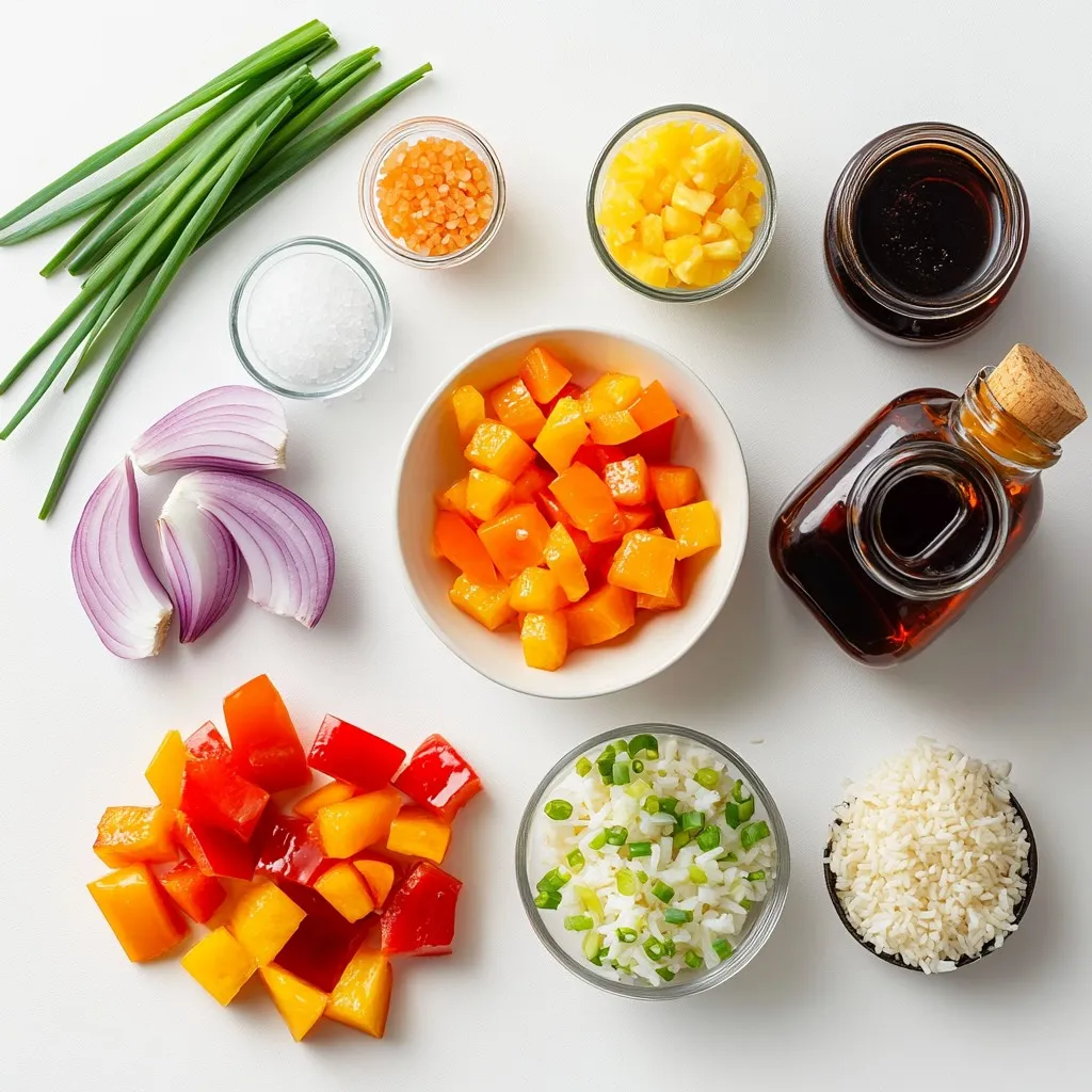 • In a mixing bowl, combine the pineapple chunks, diced bell peppers, red onion, soy sauce, honey, apple cider vinegar, minced garlic, and ginger. Mix well.
