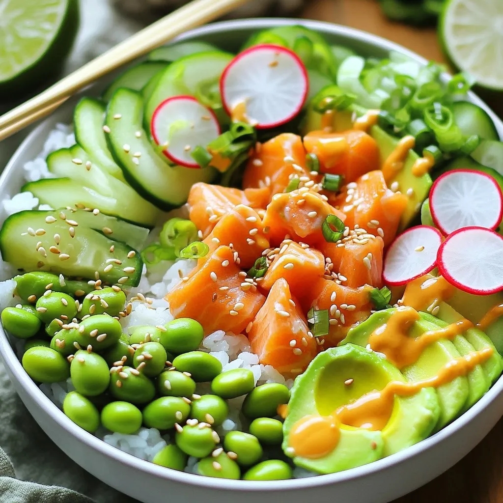 To make your sushi bowl look great, start with the rice as the base. Use a scoop of sushi rice in the center of the bowl. Place the salmon, avocado, cucumber, edamame, and radishes on top. Arrange them in a colorful way. Sprinkle sesame seeds and chopped green onions for garnish. Drizzle soy sauce and spicy mayo on top for extra flavor. For a fun touch, add nori strips around the bowl. Use chopsticks resting on top for a nice touch. A slice of lime adds color and freshness. This makes your dish pop and looks great for photos!